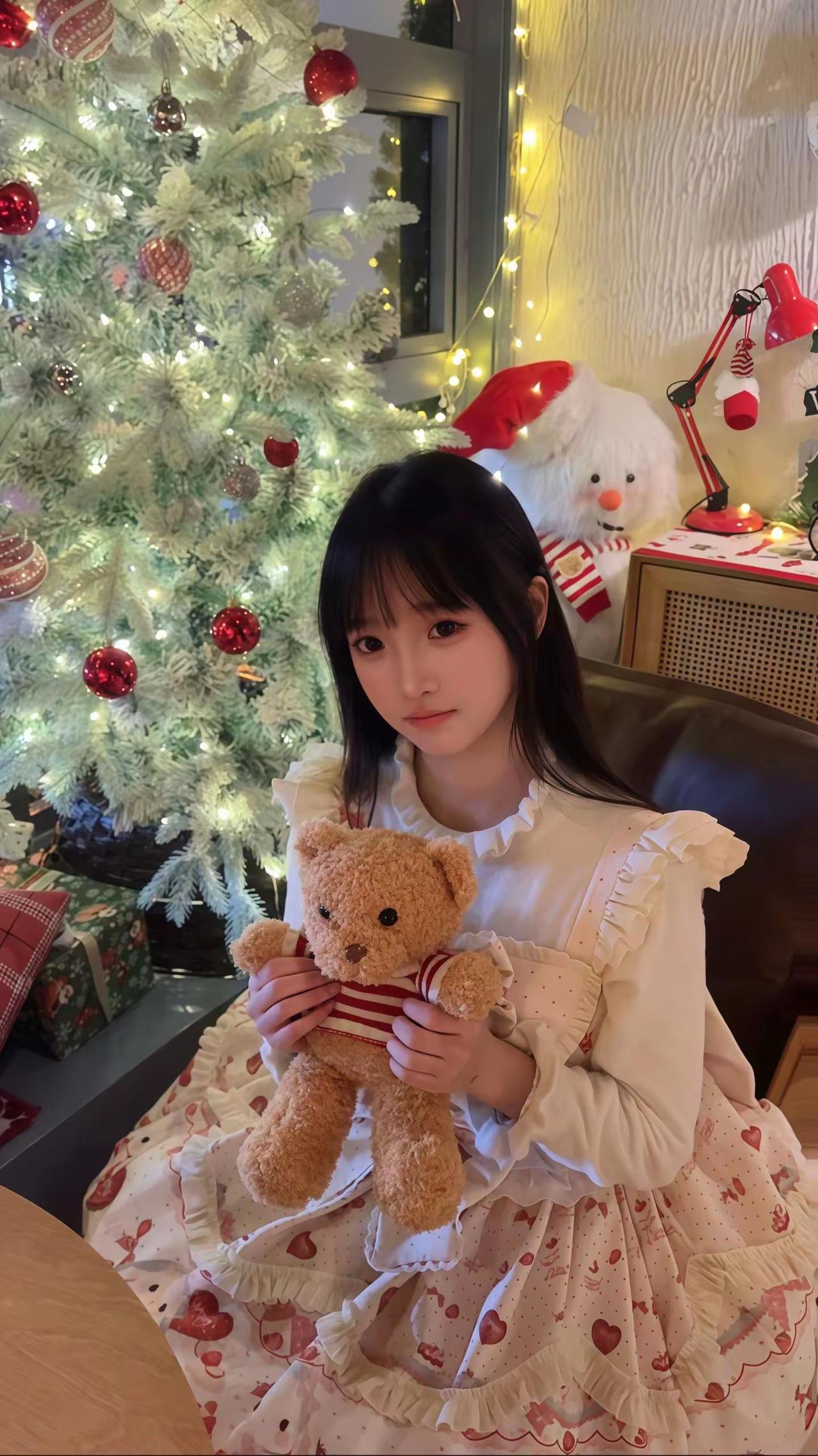 冬日暖阳下,可爱的女孩与毛绒熊相伴,圣诞树旁温馨时光。毛绒少女自拍 毛绒秋日照 毛绒酷甜照