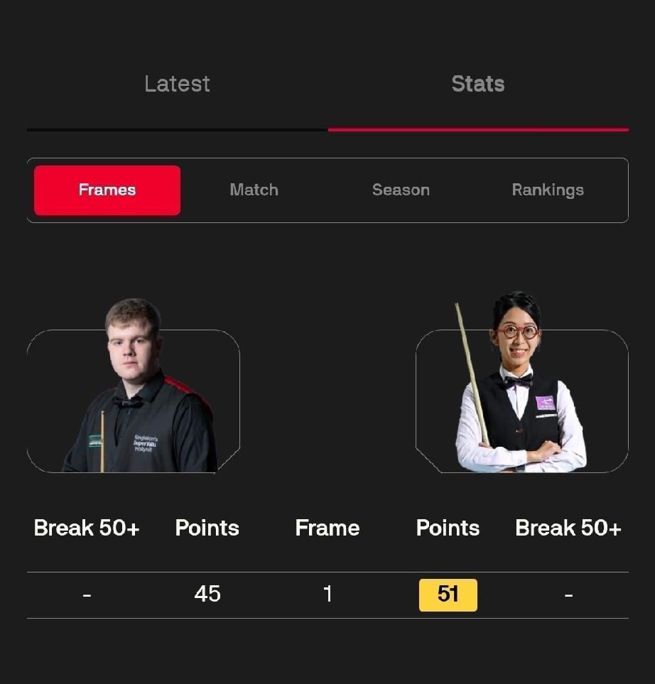 吴安仪、白雨露巾帼不让须眉! 两位驰骋在职业斯诺克赛场的中国巾帼女将!在2025斯诺克单局限时赛首轮比赛中,吴安仪淘汰了马克艾伦、白雨露逆转淘汰了了16岁的伊丽丝·斯科特,是唯二晋级64强的女球员。 在64进32轮次的比赛中,吴安仪继续前进步伐,击败亚伦·希尔,闯入32强!32进16轮次,吴安仪将对阵斯坦·穆迪。白雨露不敌奥利弗·布朗,止步64强。 期待吴安仪继续胜利!创造历史!