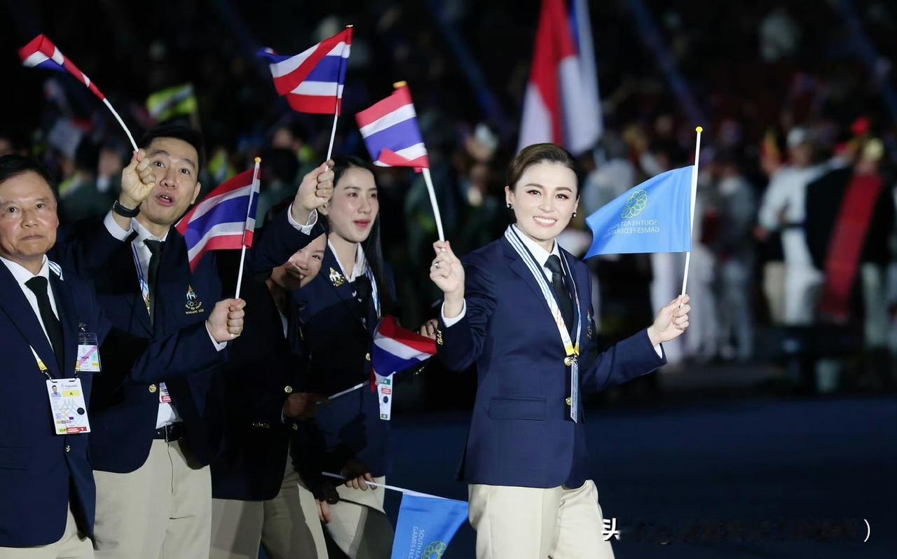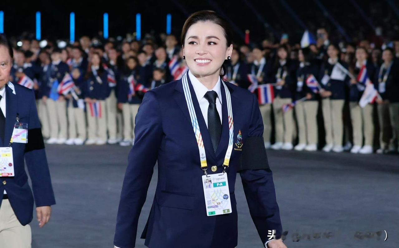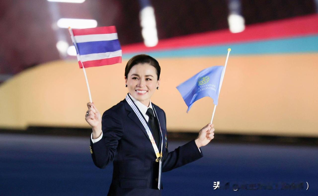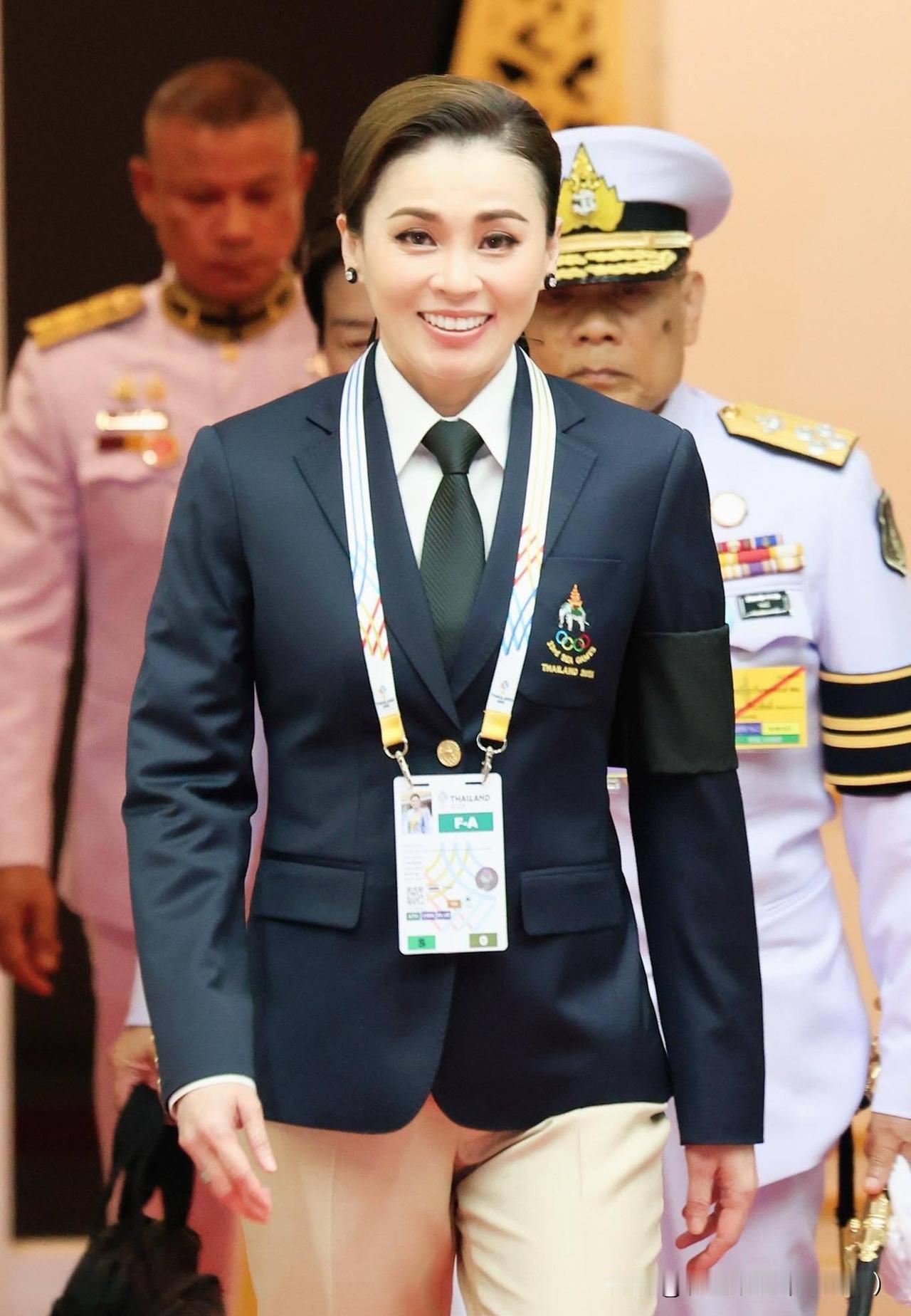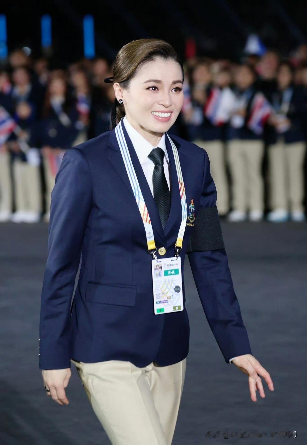 苏提达王后出席东南亚运动会开幕式。西装领带的打扮精气神十足!