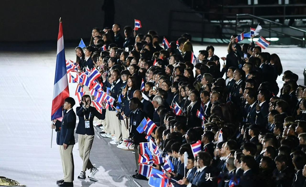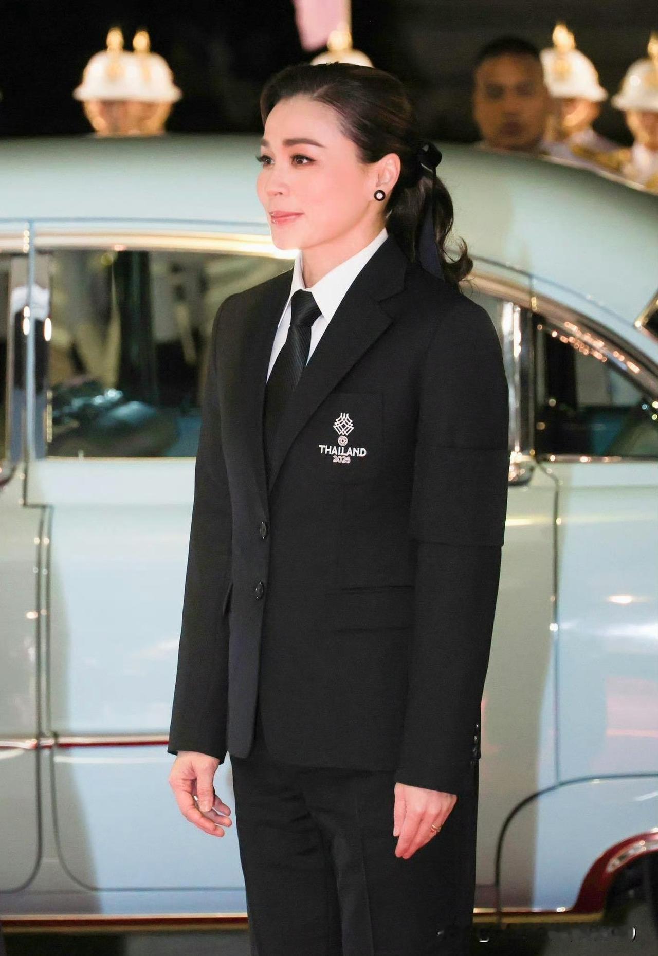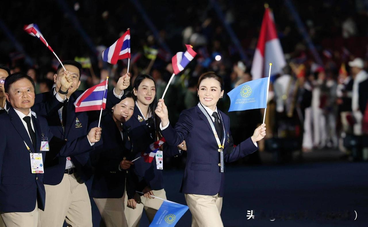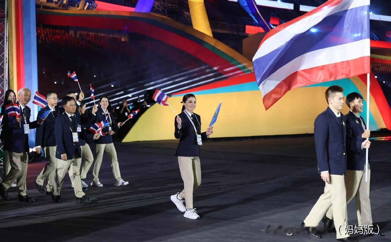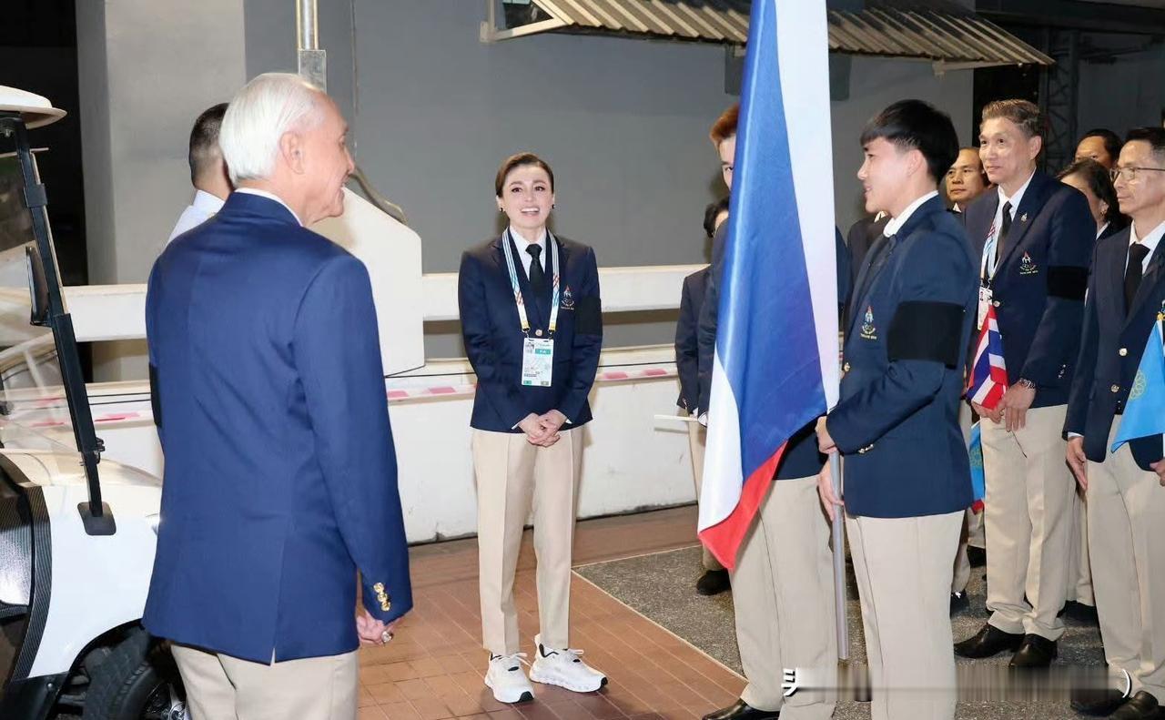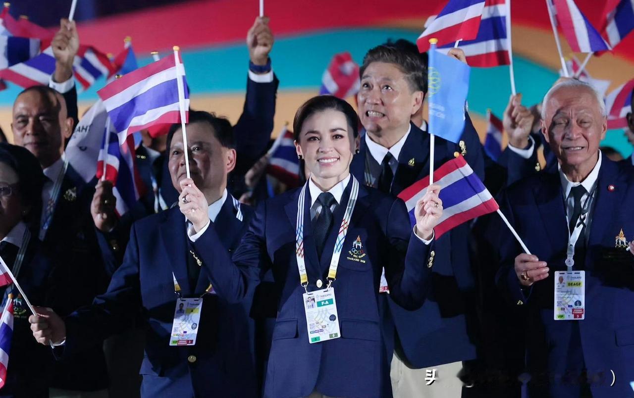 苏提达王后出席东南亚运动会开幕式。西装领带的打扮精气神十足!