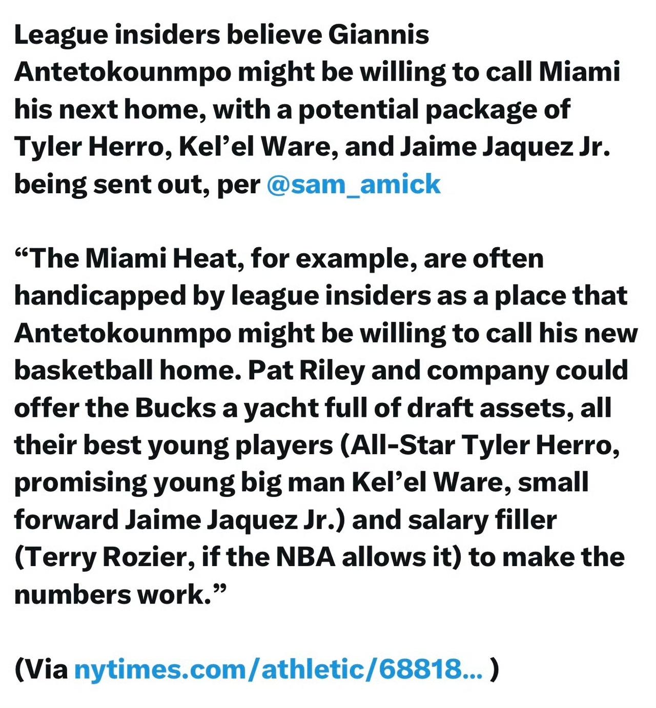 据记者Sam Amick报道,联盟内部人士透露,扬尼斯·阿德托昆博(字母哥)或将考虑把迈阿密作为下一站,热火为得到他可能送出泰勒·希罗、凯尔埃尔·威尔、小海梅·哈克斯等筹码。 热火方面可向雄鹿提供大量选秀资产、队内核心年轻球员(全明星后卫泰勒·希罗、潜力内线凯尔埃尔·威尔、小前锋小海梅·哈克斯),若NBA规则允许,还会加入特里·罗齐尔作为薪资配平球员,以此完成交易薪资结构的匹配。 热火要价 字母哥