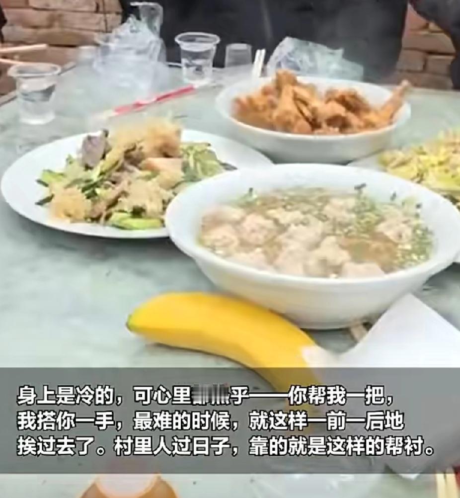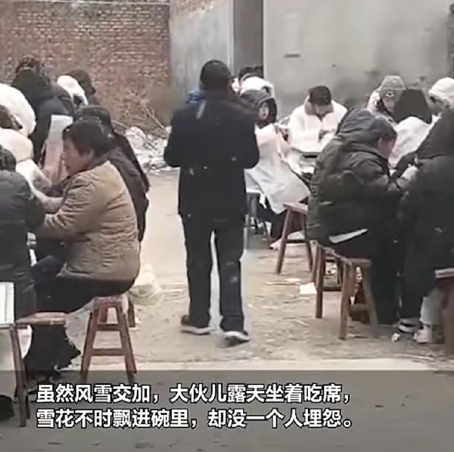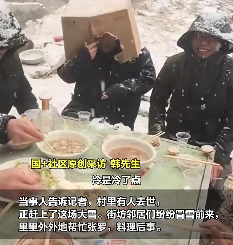 饭菜冰凉,却温暖了人心!12月12日,山东莘县一村庄有人去世,村里人吃着夹雪的饭菜,无一人抱怨半句! 有人去世恰逢大雪纷飞,村里人纷纷冒着大雪自发前来,忙前忙后地帮忙张罗着后事。 主家管饭是规矩,露天的席面上,热腾腾的饭菜端上桌,雪片子飞到碗里,转瞬间饭菜就已经冰凉。吃席的人戴着帽子,帽子上一片雪白。 村里人的传统就是这样,喜事不请不来,白事不请自来。朴实的村民们就是这样账户帮衬着,谁家的事都能挨过去。 饭菜是凉的,人心却无比的温暖! 白事