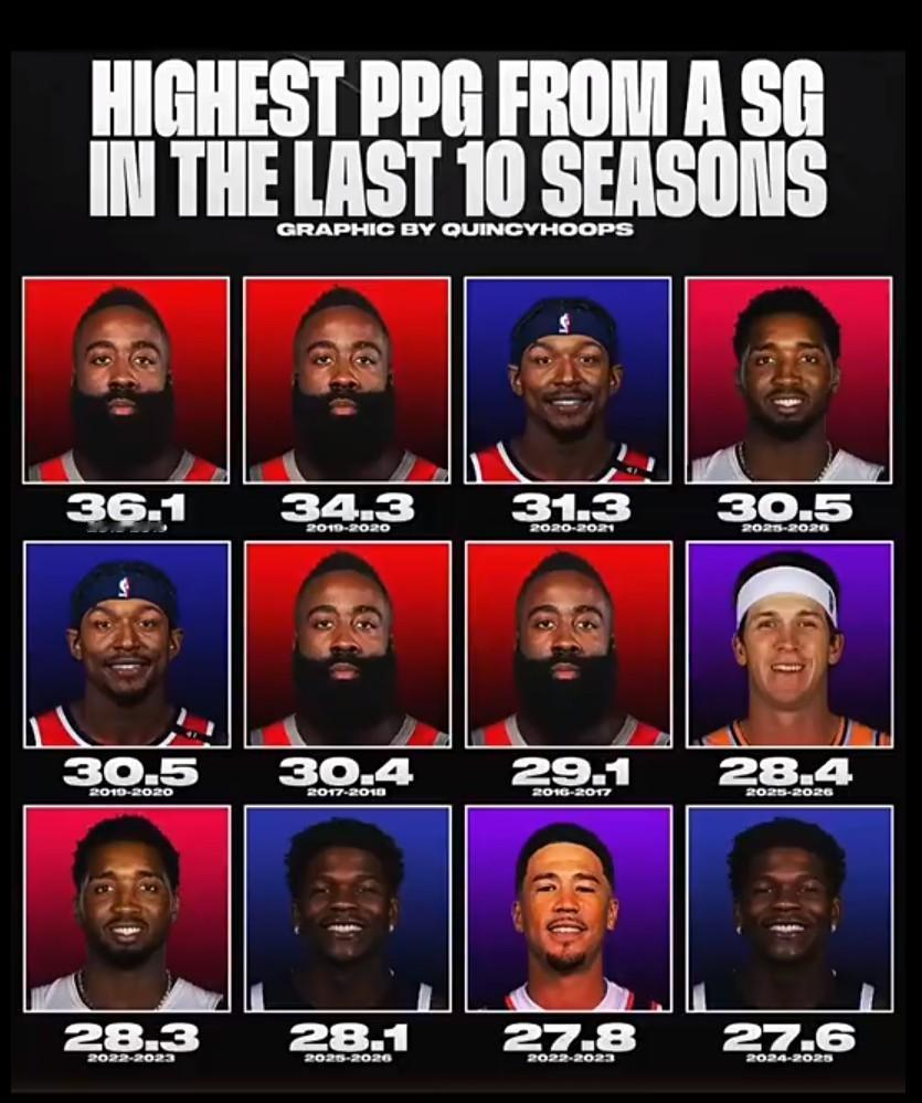 哈登独占四席!过去10年得分后卫场均得分排名: 1、哈登,18-19赛季——36.1分 2、哈登,19-20赛季——34.3分 3、比尔,20-21赛季——31.3分 4、米切尔,25-26赛季——30.5分 5、比尔,19-20-赛季——30.5分 6、哈登,17-18赛季——30.4分 7、哈登,16-17赛季——29.1分 8、爱德华兹,25-16赛季——28.7分 9、里夫斯,25-16赛季——28.4分 10、米切尔,22-23赛季——28.3分 11、布克,22-23赛季——27.8分 12、爱德华兹,24-25赛季——27.6分 哈登的场均36.1分,目前为止,依然高居历史第8,在他前面的,是6个张伯伦,以及38.3分的贝勒,和37.1分的乔丹。 很多人把现代篮球的高得分归咎于强度下降、三分更多,但事实情况并不支持这一观点,在哈登之后,也没有哪个得分王能拿到场均35分以上。 主要原因是角色球员的戏份在大幅度增多,乔丹7连得分王期间,场均出手24.2次,罚球9.1次,而过去几年的得分王,出手数都在21次左右,包括亚历山大和恩比德这样的球员,也没有出手22次以上,很多人诟病的罚球数,也没有乔丹多。 不是这些球星不愿意出手,而是现代篮球体系里的夹击和协防太多了,不可能让核心球员大量的执行一打一,角色球员需要参与其中。因此得分王的场均得分,没有球迷想象中的水涨船高,依然维持在33分左右。 哈登的36.1分,真的没那么容易超越。