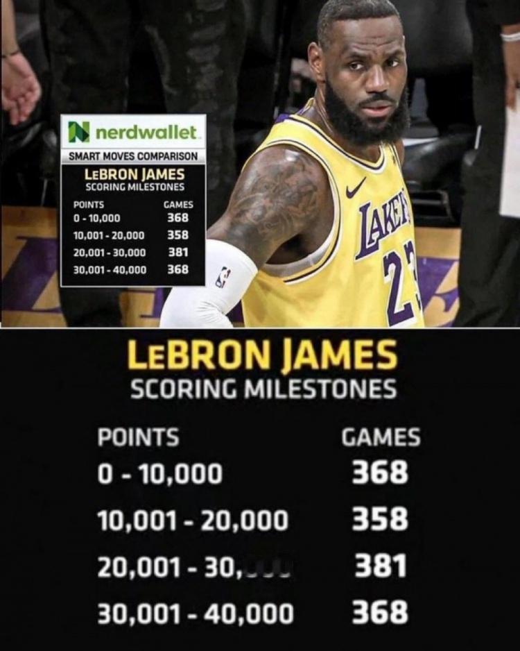 詹姆斯每10000分所用场次: 1-10000分:368场 10000-20000分:358场 20000-30000分:381场 30000-40000分:368场 这样也可以得分詹姆斯在这4个阶段的场均得分。 分别是:27.2分,27.9分,26.2分,27,2分。 这个稳定的得分背后,其实是詹姆斯贯穿生涯的超强适应能力。很多人甚至已经忘了,詹姆斯生涯初期,打的是锋卫摇摆人,这个时期的NBA是大中锋时代,然后奥尼尔状态下滑,开始4大分位的年代,艾弗森、科比、麦迪、卡特闪耀联盟,紧接着轮到小前锋时代,詹姆斯、杜兰特、安东尼、乔治等人开始登上舞台。 然后是小球时代,大量的三分球开始决定比赛胜负,再等到约基奇横空出世,联盟各个球队又开始囤积大吨位内线... 时代变化了好几茬,NBA的球风也是变了又变,但詹姆斯的得分还是那样,NBA流行什么,他就学什么。东契奇来了之后,詹姆斯练的最多的就是接球跳投,到他这个级别和年龄段,没选择吃老本,是真的值得尊重。