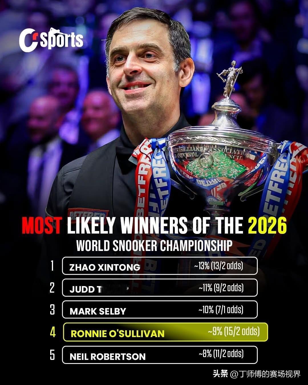 近日英国媒体根据本赛季表现和克鲁斯堡历史战绩,给出了明年世锦赛五位热门球手的夺冠概率: 1、🇨🇳赵心童:约13% (赔率13/2) 2、🏴󠁧󠁢󠁥󠁮󠁧󠁿特鲁姆普:约11% (赔率9/2) 3、🏴󠁧󠁢󠁥󠁮󠁧󠁿塞尔比:约10% (赔率7/1) 4、🏴󠁧󠁢󠁥󠁮󠁧󠁿奥沙利文:约9% (赔率15/2) 5、🇦🇺尼尔·罗伯逊:约8% (赔率11/2) 卫冕冠军赵心童力压特鲁姆普和塞尔比,成为最有可能夺得明年世锦赛冠军的球手,不得不说英国媒体真的非常忌惮赵心童,即便历史上存在“克鲁斯堡”魔咒,看来他们还是认为赵心童有可能成为第一个打破魔咒的人,你认为谁会捧起2026年世界斯诺克锦标赛的冠军奖杯?