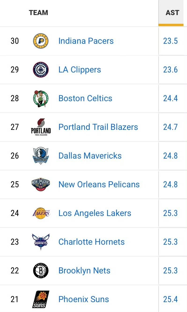 洛杉矶湖人队(Los Angeles Lakers)尽管拥有三核阵容,场均助攻数仅为25.3次,在联盟助攻榜中位列第24位,也就是联盟倒数第7名。 21 菲尼克斯太阳 25.4次 22 布鲁克林篮网 25.3次 23 夏洛特黄蜂 25.3次 24 洛杉矶湖人 25.3次 25 新奥尔良鹈鹕 24.8次 26 达拉斯独行侠 24.8次 27 波特兰开拓者 24.7次 28 波士顿凯尔特人 24.4次 29 洛杉矶快船 23.6次 30 印第安纳步行者 23.5次 你发现没有:除了太阳和湖人以外其他都是战绩靠后的! nba 湖人