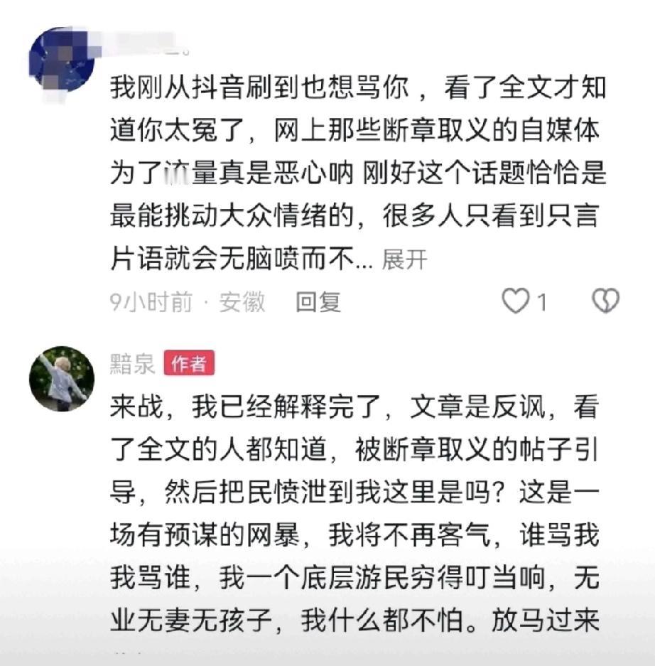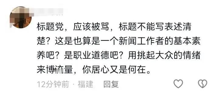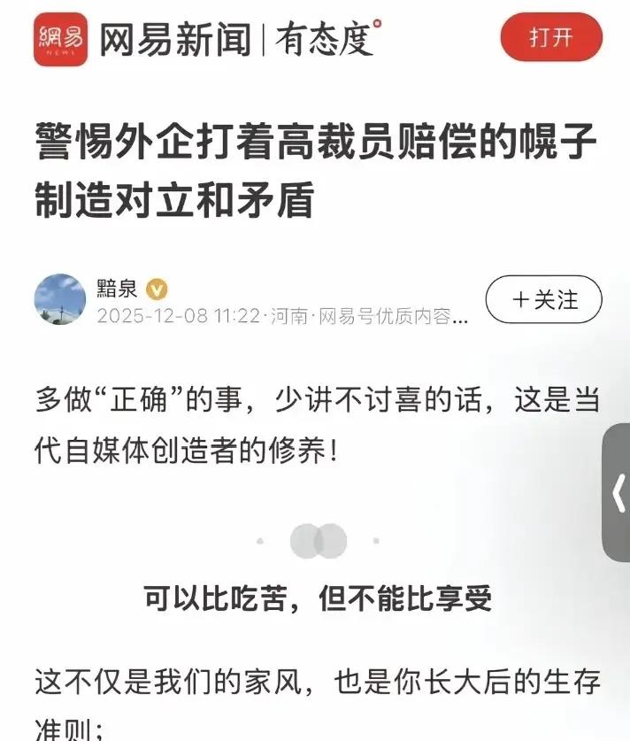 退网了,这都是自找的,怨谁? 我并没有去网易看这个帖子,也是从抖音和头条上看到的。具体内容在这里看不到,但看该文章的标题,的确容易让太多的网民反感,招骂也只能说是自找的。 后来又有网民说,该文儿的写者写这篇文章内容是在反讽,题目和内容表述的是完全不同的两个意思。 这下应该是让人明白了写者的意图,就是用一个容易激起网民不满或愤怒的文章标题来吸引你,以达到引流的目的,这不就是个标题党吗! 只是写者此时用如此容易触动网民神经的字眼,来作为文章的标题,实在是偷鸡不成蚀把米,搬起石头砸了自己的脚。 网民看到这样的文章标题,瞬时激起的愤怒,谁还有心情去看你文章的内容是怎么写的呢,流量没引来,抨击和骂声倒是如海浪般涌了过来。 “退网了,你们随意”,这只能说是咎由自取,怨不得任何人。 这也算是给那些喜欢用标题党来做文章题目的写者,敲了一记警钟吧!