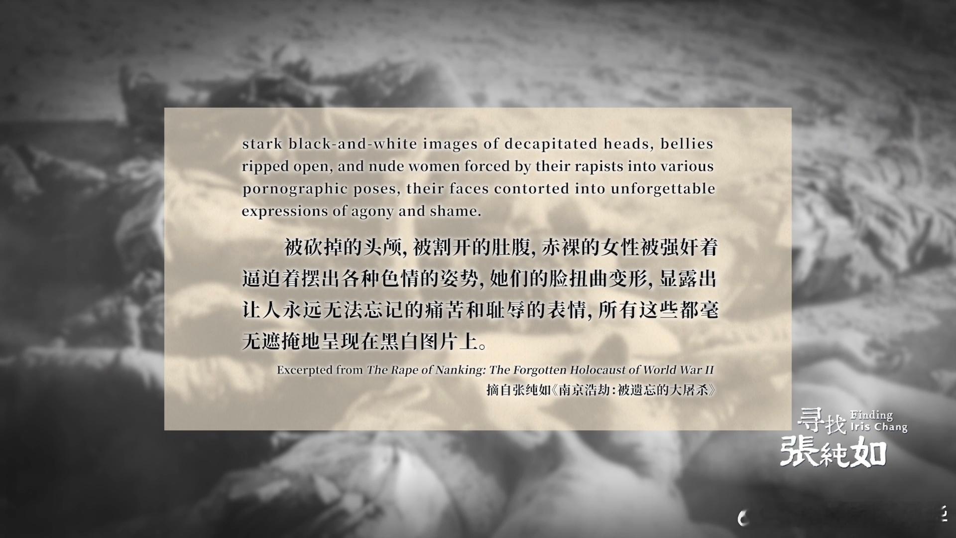 原来外国人不知道1937年的南京她用一本书打破半个多世纪的沉默 一段被西方遗忘的血色历史,一位以生命守护真相的勇者。张纯如耗时三年著书立说,《南京浩劫》让南京大屠杀的真相震撼国际社会。铭记历史,致敬为真相发声的她。纪录片寻找张纯如