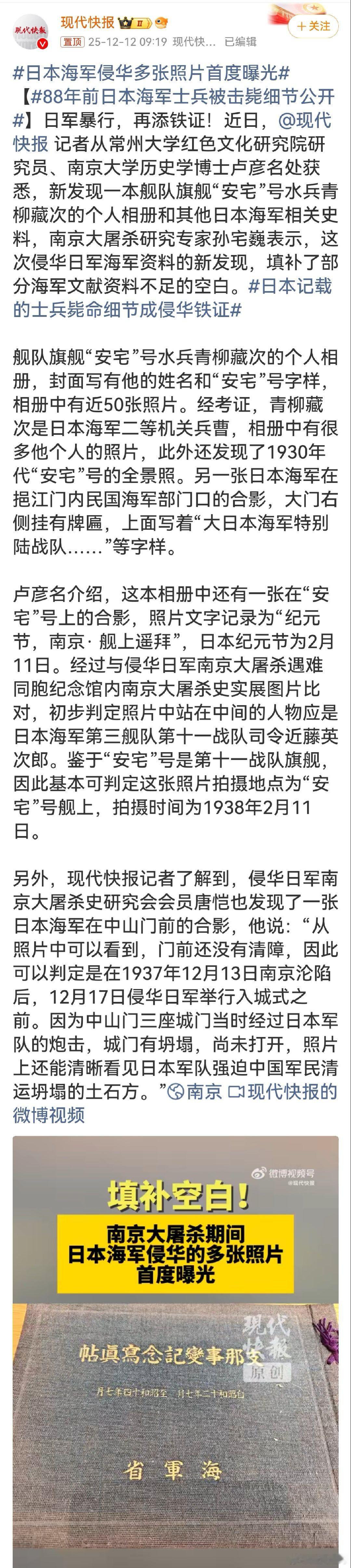 日本海军侵华多张照片首度曝光这些新发现的日本海军侵华照片和史料是铁一般的罪证,再次将日军暴行公之于众,让那段黑暗历史的细节更加清晰。照片中日军的丑恶行径、对中国军民的迫害历历在目,提醒着我们不能忘却历史,要铭记日军侵华的惨痛过往,捍卫历史真相,防止悲剧再次上演。