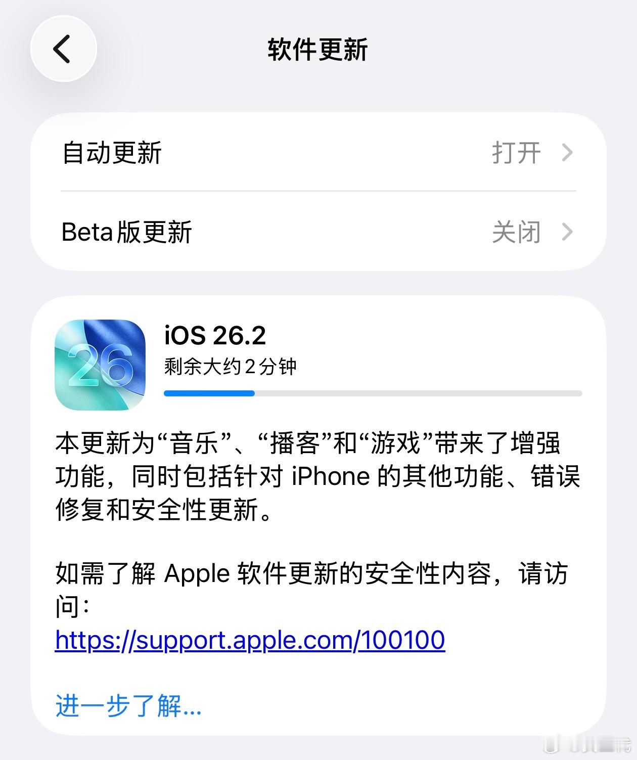 给iPhone Air升级iOS26.2,3个多G的大包不常见(顺便test一下能不能正常发出微博)