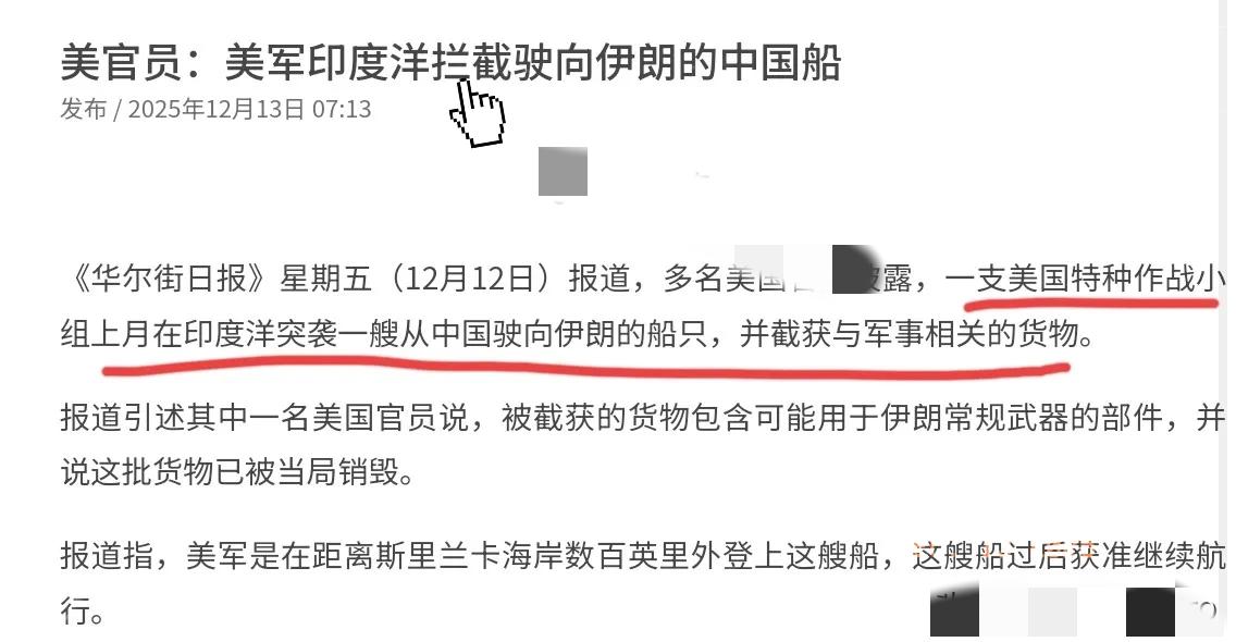 太嚣张了,银河号事件再现!美国公开登检从中国开往伊朗的船只!12月12日,根据《华尔街日报》报道,多名美国官员披露,一支美国特种作战小组上月在印度洋突袭一艘从中国驶向伊朗的船只,并截获与军事相关的货物。其中一名美国官员说,被截获的货物包含可能用于伊朗常规武器的部件,这批货物已被当局销毁。 所谓“军事相关货物”根本没任何实锤证据,既不公布清单也不展示影像,转头就说“销毁”,说白了就是毁灭自己造谣的痕迹。公海航行的商船凭啥被美国随意登检?这哪里是主权国家行为,分明是海盗式抢劫。 美国自己是全球最大军售国,却不准别人正常贸易,典型的双重标准。32年前银河号的屈辱还没忘,如今故技重施,无非是看清了霸权才是他们的行事逻辑。 弱国无外交,海上通道的安全从来不是靠国际法,而是靠硬实力。你觉得我们该如何进一步守护海外贸易的合法权益?