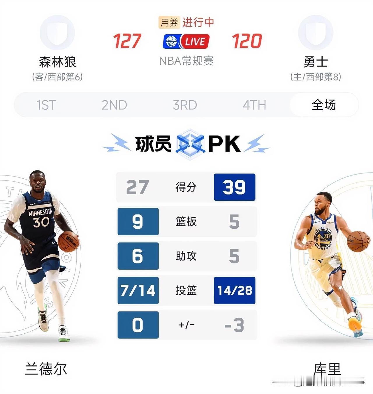 库里复出无奈成“空砍群主”,勇士120:127不敌森林狼。 今日勇士主场迎战森林狼,库里复出,前三节双方打得难解难分,比分交替领先,勇士仅以3分优势进入末节争夺,最后一节森林狼的进攻火力更猛,单节净胜10分,最终127:120战胜勇士。 库里砍下39分5板5助,无奈成为“空砍群主”,兰德尔是森林狼取胜的首功之臣,全场14投7中砍下27分,另有9板6助入账。 两队目前分列西部第六和第八(森林狼第六勇士第八)。