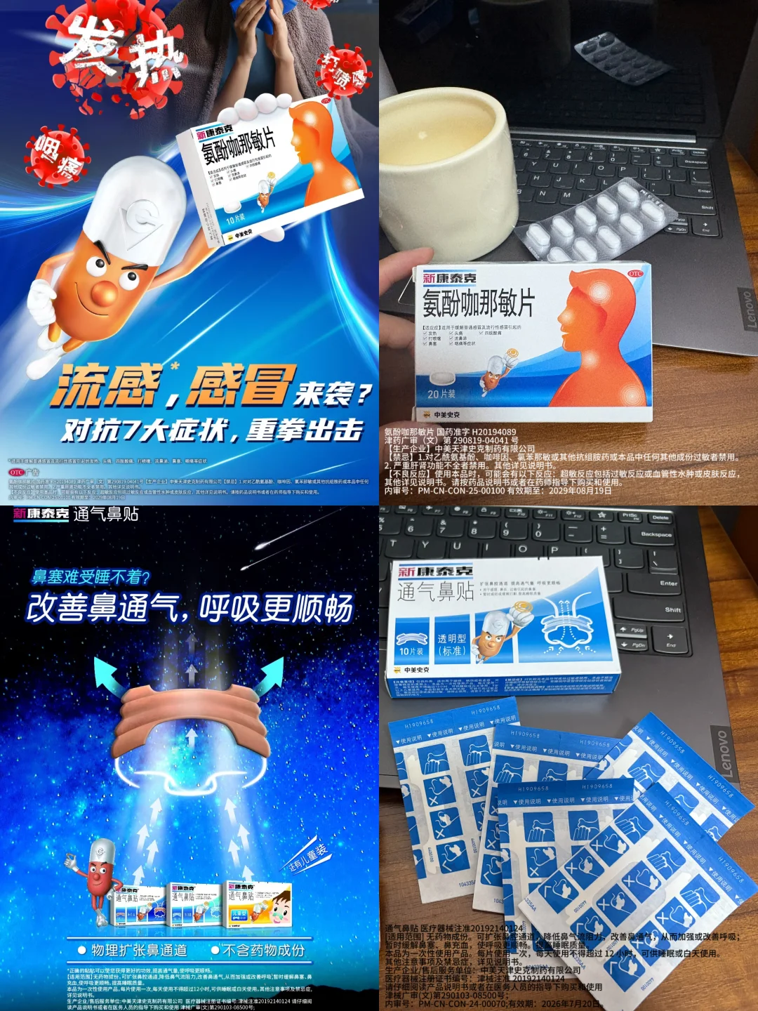 氨酚咖那敏片【禁忌】1.对乙酰氨基酚、咖啡因、氯苯那敏或其他抗组胺药或本品中任何其他成份过敏者禁用。2. 严重肝肾功能不全者禁用【不良反应】使用本品时,可能会有以下反应:超敏反应包括过敏反应或血管性水肿或皮肤反应。内审号:PM-CN-CON-25-00100 有效期至:2029年08月19日通气鼻贴 津械广审(文)第290103-08500号;内审号:PM-CN-CON-24-00070;有效期:2026年7月20日。盐酸赛洛唑啉鼻用喷雾剂 【禁忌】1.萎缩性鼻炎及干燥性鼻炎禁用。2.高血压、冠心病、甲状腺功能亢进、糖尿病、闭角型青光眼等患者禁用。【不良反应】1.用的过频易致反跳性鼻充血,久用可致药物性鼻炎。2.少数人有轻微烧灼感、针刺感、鼻黏膜干燥或刺激以及头痛、头晕、恶心、心率加快等反应。内审号:PM-CN-CON-25-00066 有效期至:2026年06月20日新康泰克新康泰克氨酚咖那敏片对乙酰氨基酚新康盐酸赛洛唑啉新康通气鼻贴感冒药感冒药推荐感冒吃什么药
