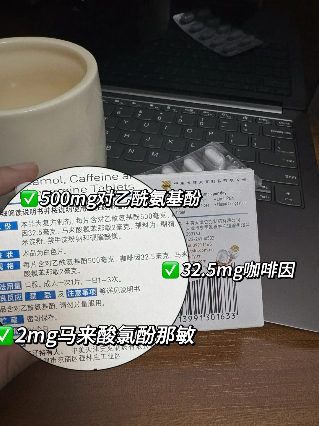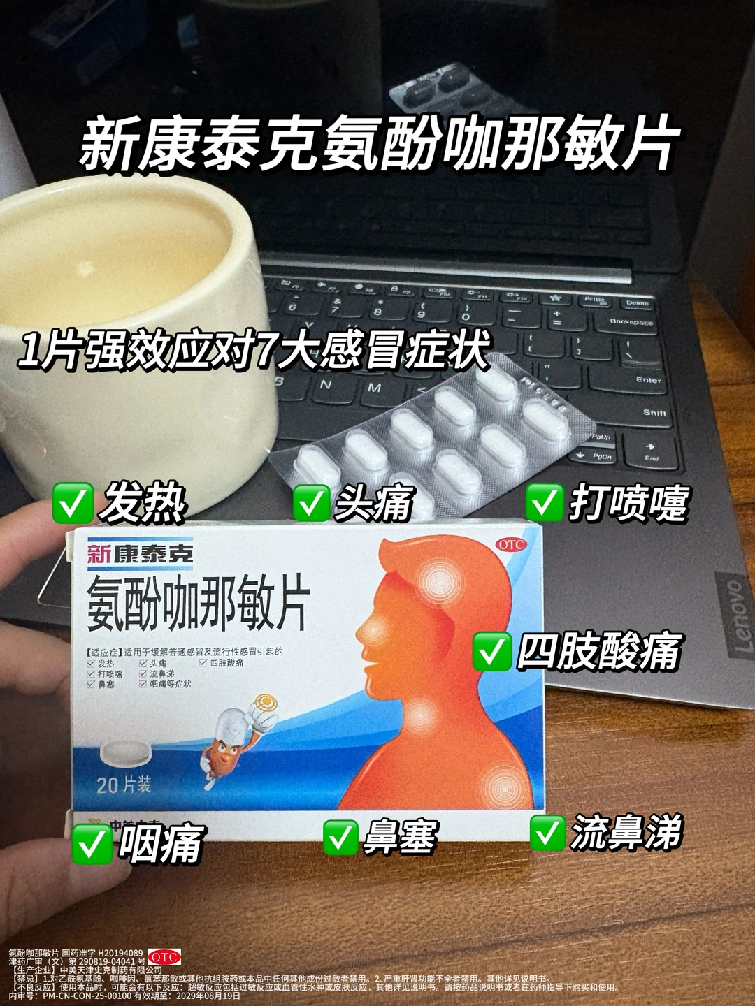 ✨有多种症状时可选择像新康氨酚咖那敏片这样能应对头疼、四肢酸痛、打喷嚏、流鼻涕等多种症状的💊。这源于其三大核心成分:发热、头痛依靠500mg对乙酰氨基酚,足量添加,市面上一般都是200-300mg;流鼻涕、打喷嚏依靠马来酸氯苯那敏,抗组胺作用,应对鼻部不适;特别添加32.5mg咖啡因,对抗嗜睡头晕。