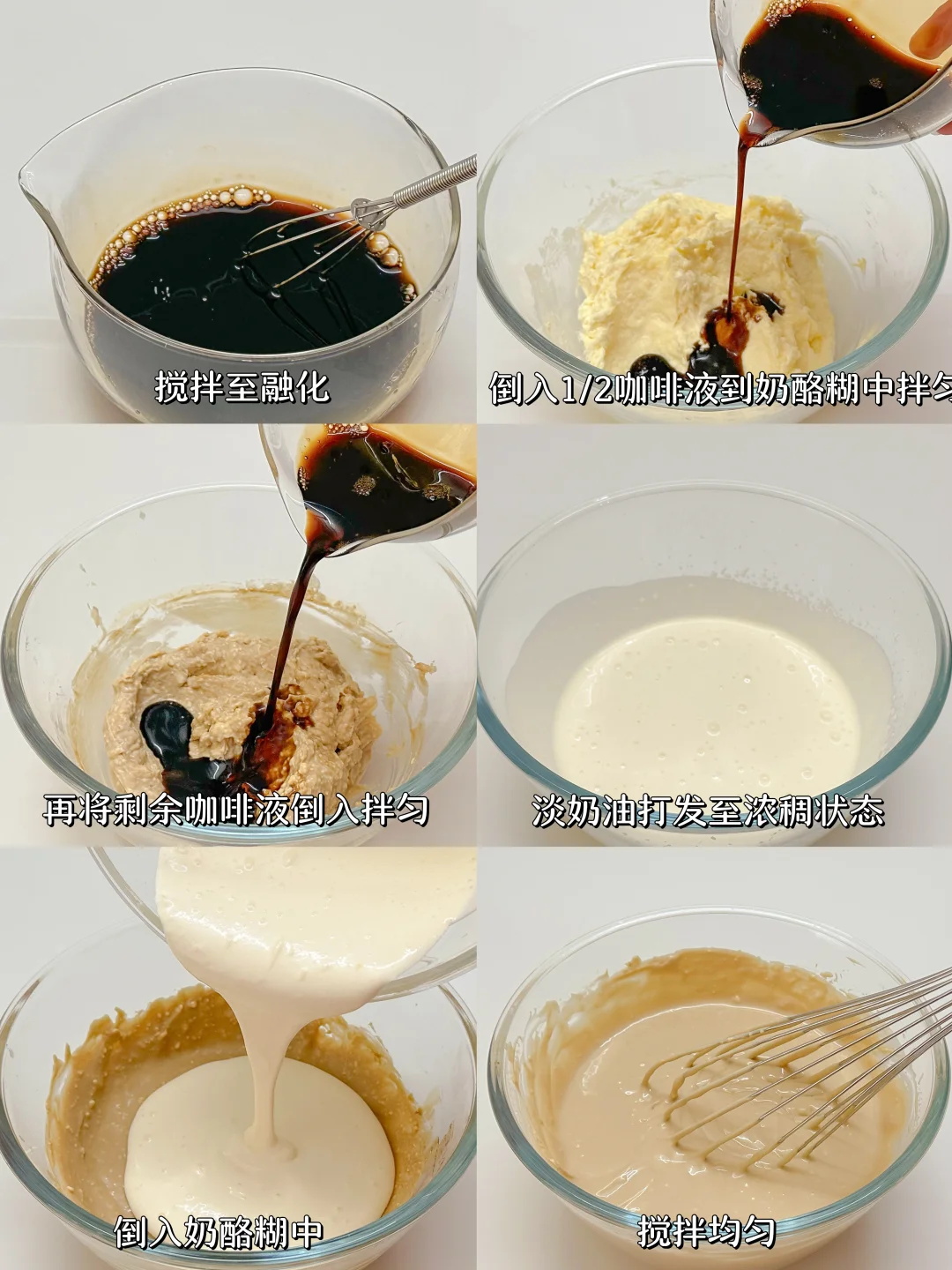 2️⃣软化的奶油奶酪加白糖拌匀,热浓缩咖啡液加泡软的吉利丁搅拌融化,咖啡液分两次倒入奶酪糊中搅匀,淡奶油打发浓稠倒入奶酪糊中搅拌均匀。