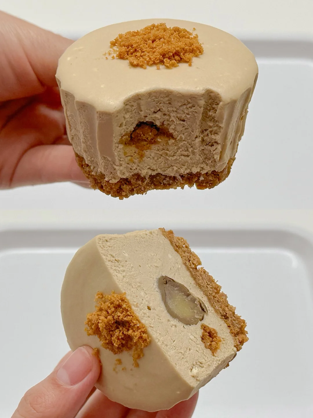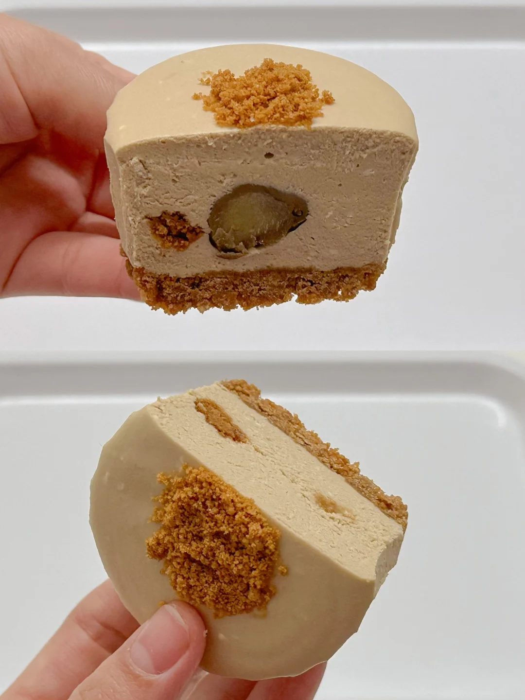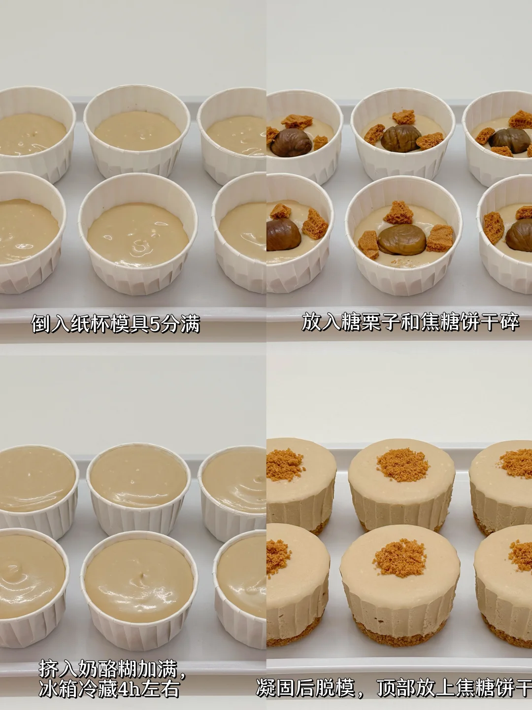 3️⃣将芝士奶酪糊倒入纸杯模具5分满,放入1颗糖栗子和焦糖饼干碎,再挤入奶酪糊加满,冰箱冷藏4小时左右,凝固后脱模,顶部放上焦糖饼干碎即可。