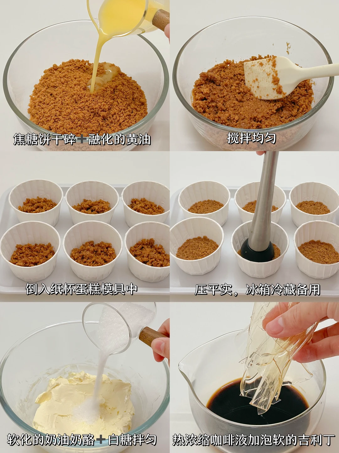 1️⃣焦糖饼干碎加融化的黄油搅拌均匀,倒入纸杯模具中压平实,冰箱冷藏备用。