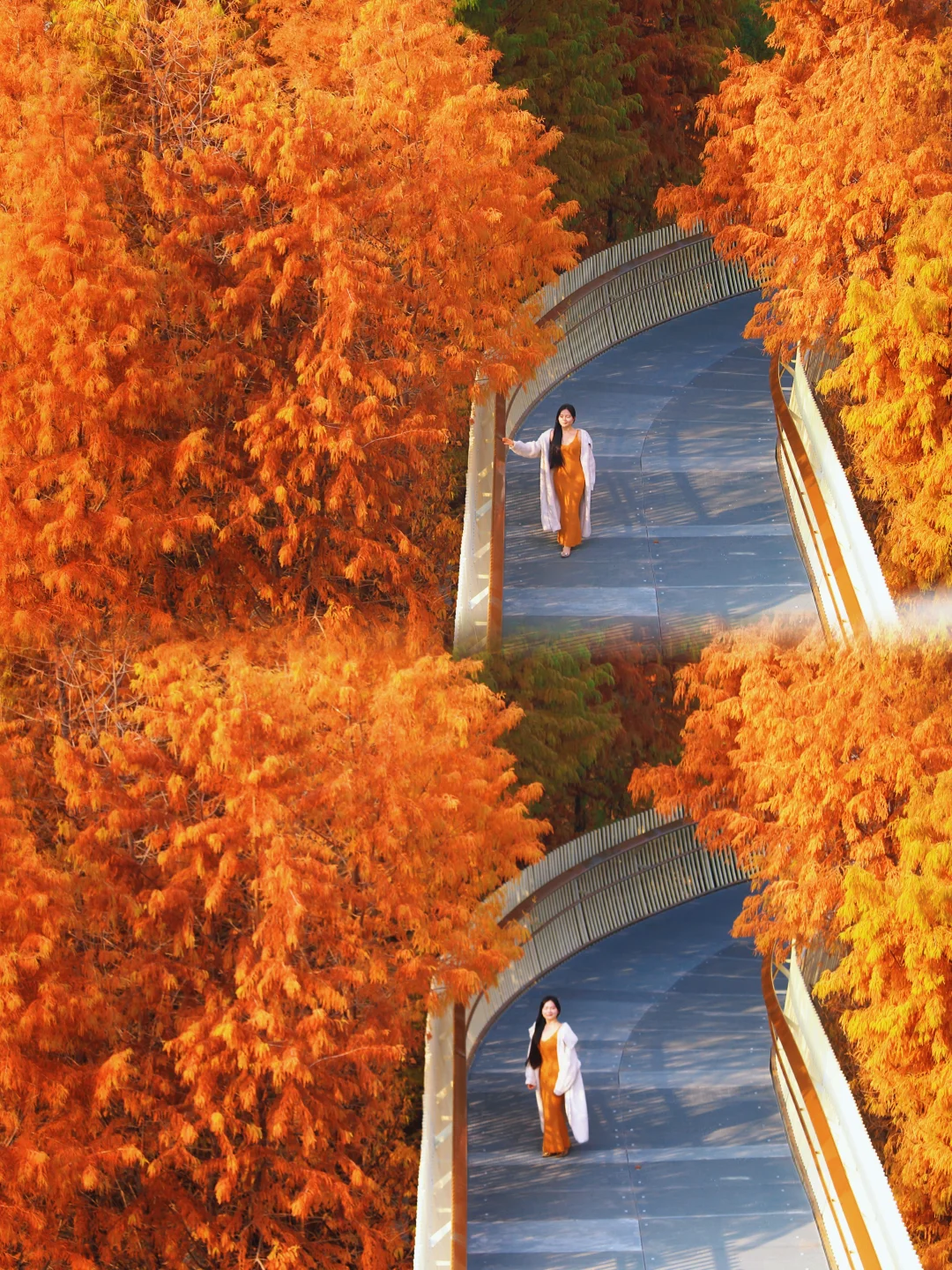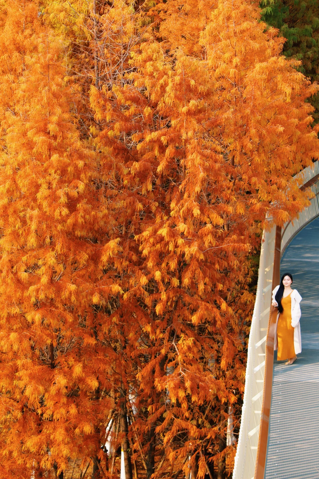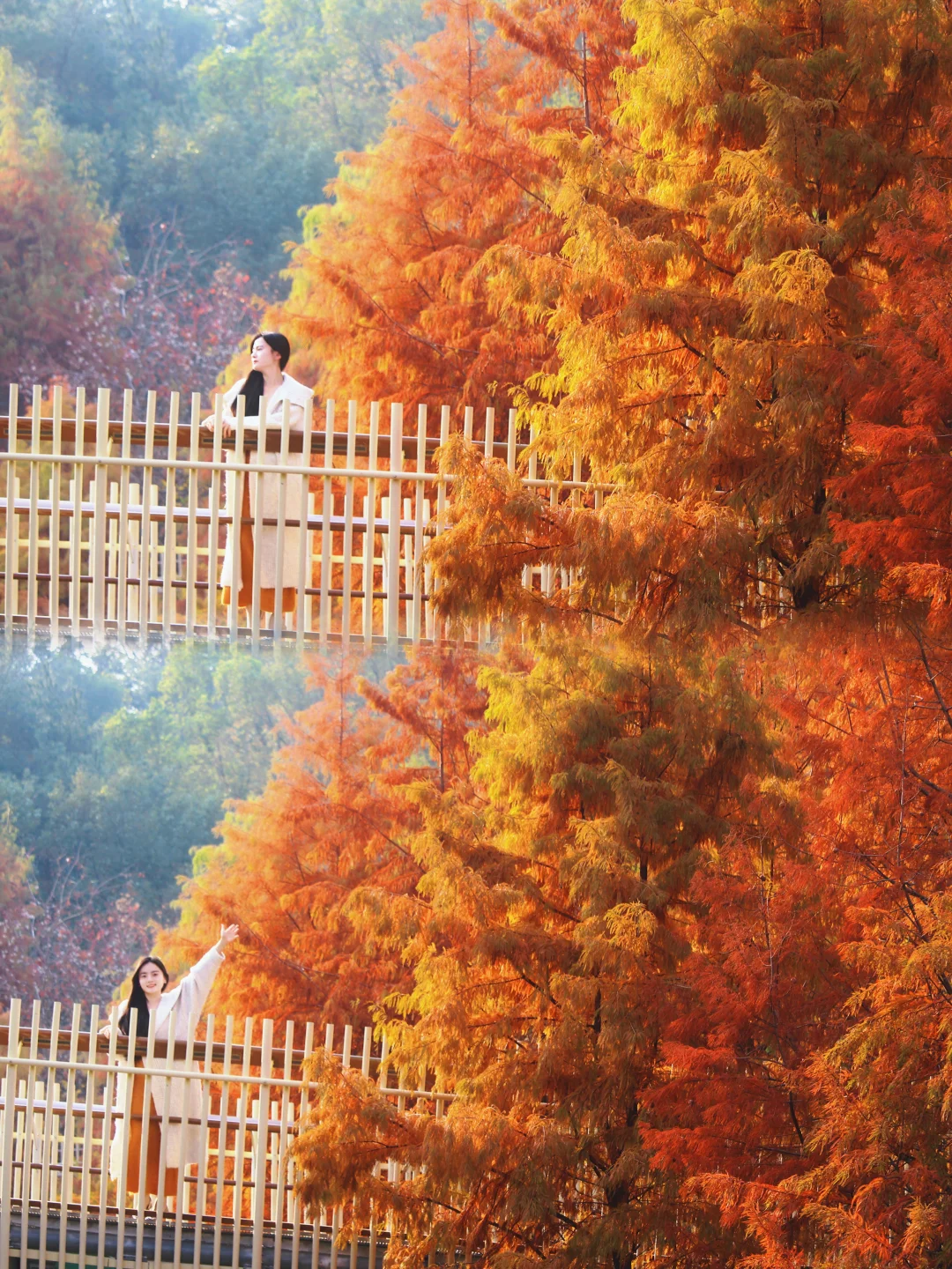 秋天的磨盘山森林公园真的太美了!漫步在红杉树丛里的步道,真的太浪漫了!从东门进,红杉树就集中在前面几个栈道圈中,从上往下拍非常出片!