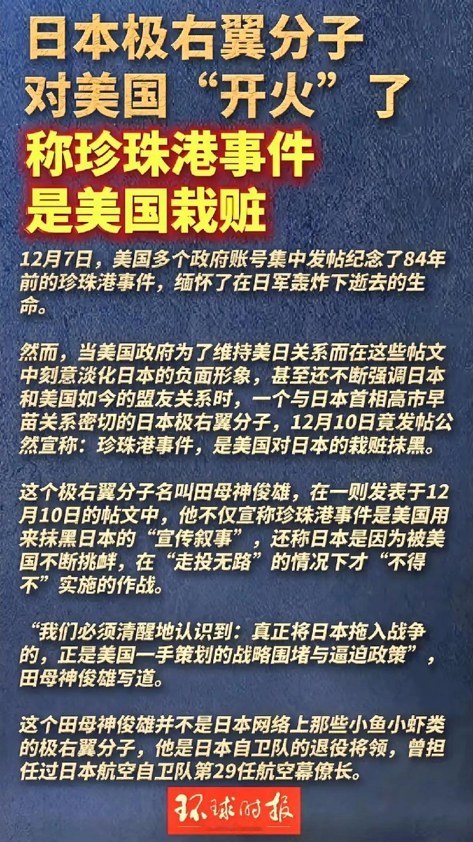日本极右翼连美国都不放过了。 说当年的珍珠港事件是美国人栽赃陷害的,是日本人走投无路的情况下,不得已的作战。 说的好像,整个第二次世界大战过程当中,日本始终处于一个被害者的地位,还真是厚颜无耻。 这也是美国人自己造的孽,不断地纵容日本这个二次世界大战中的罪魁。 现在好了,日本人反咬一口,说当年是被美国人逼迫的。 不过以特朗普的尿性,如果关注到这个事情并发声的话,恐怕说出来的话就不会那么好听了。