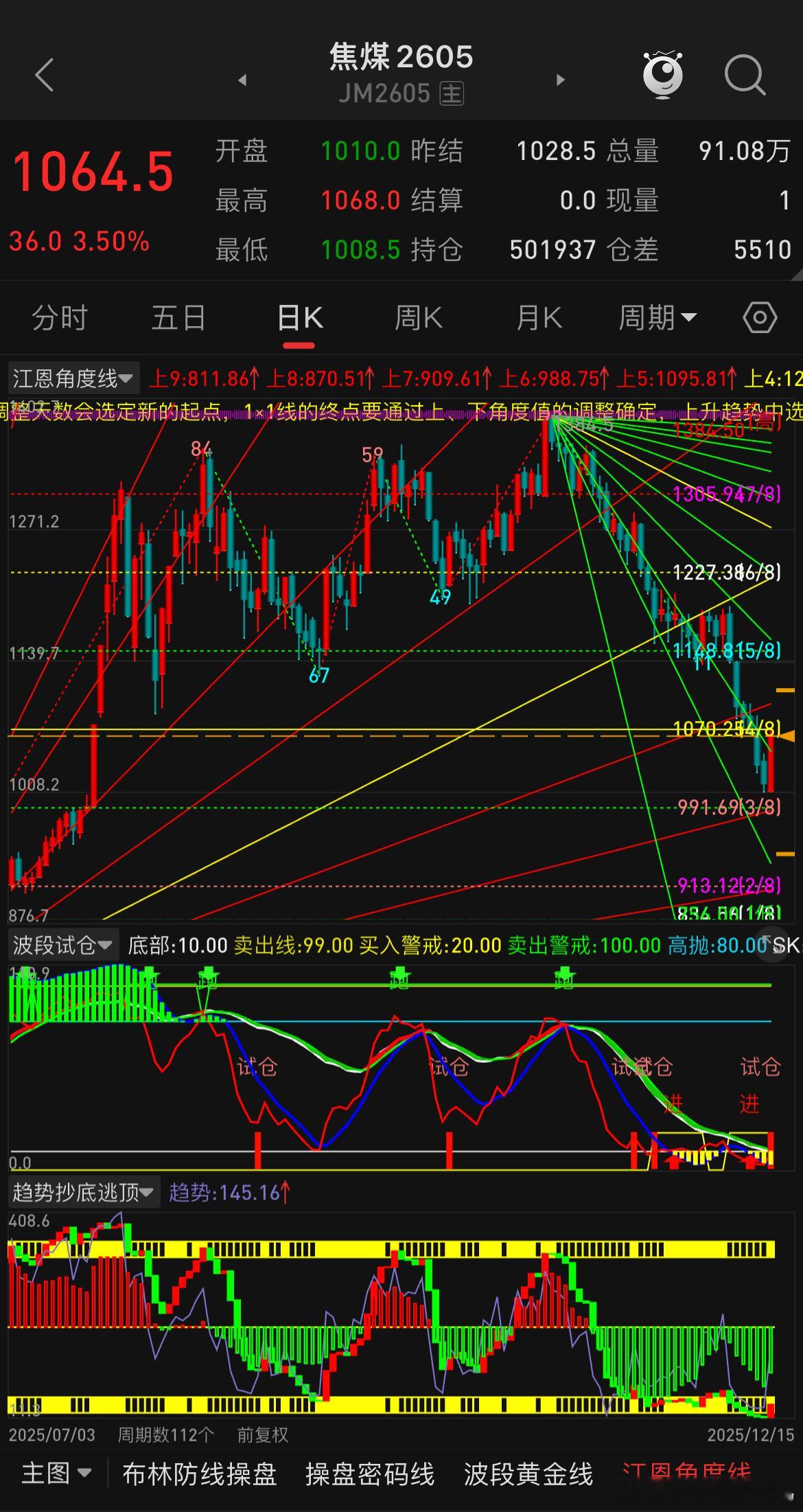焦煤本周整体回撤力度明显加大,周五晚盘一根线拉上来了,但是否见底有待商榷,做底的过程会有反复,不要看到行情动了就去追,磨底阶段是有机会等到合适低位的,不要一味抢进,当下多空还是不太明朗,说见底反转还尚早,不要想着完美交易一定要抢低点,提前进场容易磨盘影响持仓,波段取段才是合理交易,下周配合商品指数以及板块联动等上一等看看再说。焦煤