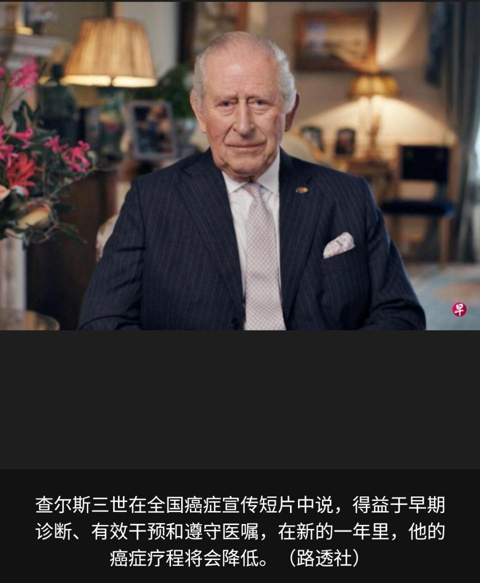 寰球镜头现在得癌症的是真不少,希望医学技术能够更快的发展,愿天下无癌。英国国王查尔斯三世说,他的医生可以在2026年降低他的癌症疗程。他说,这是一个恩典,并归功于现代医疗进步。路透社报道,查尔斯三世星期五(12月12日)在电视播出的全国癌症宣传短片中宣布这个好消息。现年77岁的查尔斯三世去年2月确诊患有某种癌症。海外新鲜事