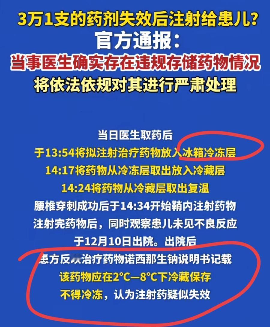 重庆医院为患儿注射违规储存药物,治疗脊髓性肌萎缩症的诺西那生钠注射液,曾经的进口国外天价药,进医保后,现在从70万降到3万多,就这也挺贵,所以这次患儿家人很在意,质疑药物疑似失效! 当事医生太大意了,怎么储存,外包装名字下面,写得很显眼很清楚,2—8密封保存,不得冷冻!看不到吗?其它廉价日常药就算了,这药不上点心?看似小细节小事,关系药物疗效,又是治疗儿童罕见病,关系儿童生命健康!当地卫健委处理态度很好,不遮不掩,承认违规,将严肃处理!也警示所有医院、每一名医务人员!看后续!