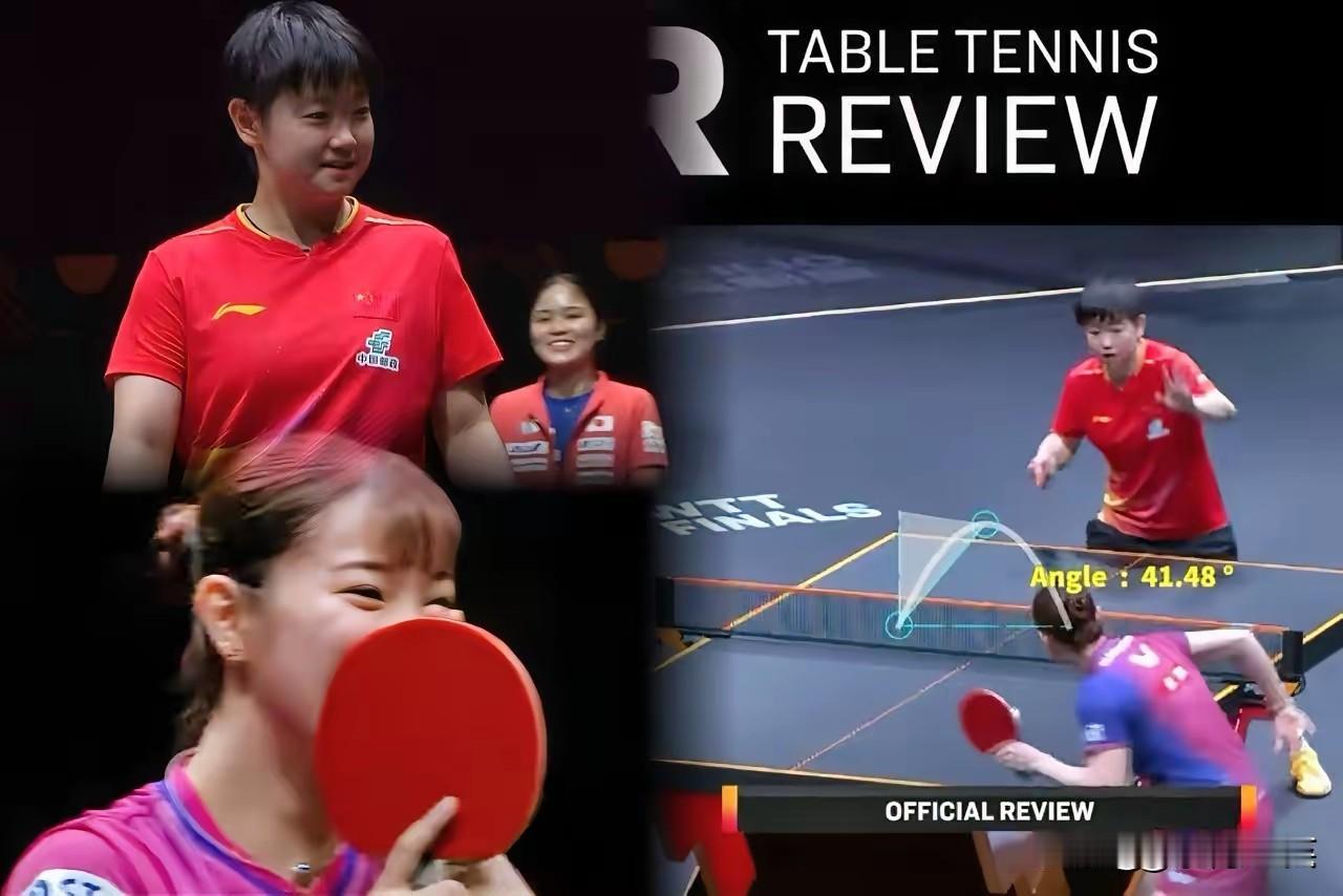 鹰眼挑战 莎莎是第一次 有些不熟练 比画了一个大框框 但莎莎的眼睛真的是尺子 不仅量出打球的精准角度 还量对手的回抛 顺便也给裁判提了个醒 也许裁判太喜欢看莎莎打球了 把自己的职责忘了[我想静静] 长崎美柚知法犯法 不然莎莎一挑战 她就不好意思的笑了 还用球拍半遮面 连场边教练都不自在的笑了 美女长崎美柚真的很漂亮 被莎莎打了一个11-1 还是笑的很开心 跟世一过招 也是挺不错的经历 不是每个人都能走到莎莎面前 莎莎把她的对手都打成了好朋友 这就是莎莎的人格魅力