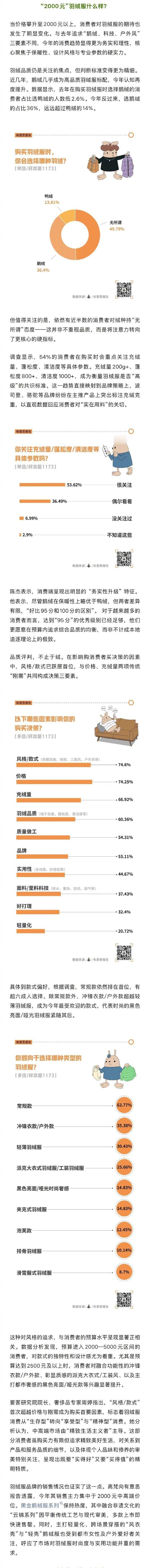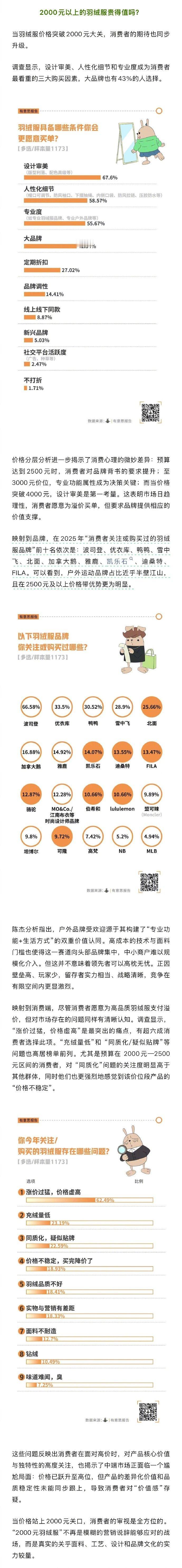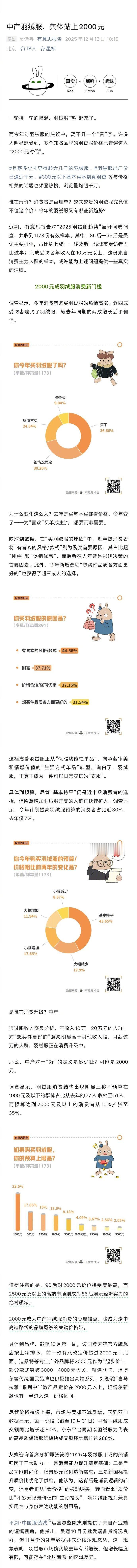 【中产羽绒服集体站上2000元】越来越贵的羽绒服究竟值不值这个价 一轮接一轮的降温,羽绒服“热”起来了。而今年对羽绒服的热议中,离不开一个“贵”字。许多人明显感受到,多个知名品牌的羽绒服价格已普遍进入“2000元时代”。“月薪多少才穿得起大几千的羽绒服”“羽绒服出厂价已逼近千元”“300元以下基本买不到真羽绒”等与价格相关的话题也频登热搜。 谁在涨价?消费者是否埋单?越来越贵的羽绒服究竟值不值这个价?今年的羽绒服又有哪些新趋势? 近期,有意思报告对“2025羽绒服趋势”展开问卷调查,共收到1173份有效样本。其中,85后—95后是受访主要群体,占比约七成;一线及新一线城市受访者占比过半;六成受访者年收入在10万元以上。这份来自消费主力人群的样本,或许能为上述问题提供一些真实的注脚。