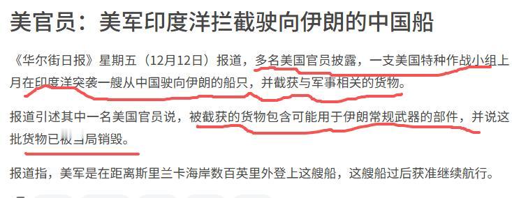 美国即做初一,我们就可做十五,直接拦截从美国运往台岛的军售船只! 据《联合早报》12月12日报道,多名美国官员披露,一支美国特种作战小组在上月于印度洋采取了一次突袭行动,目标是一艘从中国驶向伊朗的船只。 美军不仅强行登上了这艘船,还截获了所谓与军事相关的货物,一名美国官员含糊其辞地表示这些货物包含可能用于伊朗常规武器的部件,随后便将这批货物擅自销毁,而这艘船在遭此无端骚扰后才被获准继续航行。 报道中始终没有明确这艘船是否为中国船只,但无论其船籍归属如何,美国这种在距离斯里兰卡海岸数百英里外的国际公海上,随意拦截、登船、销毁货物的行为,都已经突破了国际法的底线,让人瞬间想起了1993年那段让国人倍感屈辱的银河号事件。 当年,中国远洋运输总公司的“银河号”货轮从天津新港起航,载着文具、小五金等普通商业货物驶往中东,却在阿曼湾遭到美国无端指控,声称船上载有制造化学武器的原料。 美军随即派出2艘军舰和5架直升机,在公海上对“银河号”进行围堵监视,逼迫货轮在霍尔木兹海峡东口抛锚漂航长达22天。 期间,美国向沿线港口施压,禁止“银河号”停靠卸货,38名船员在海上孤立无援,承受着高温、缺水缺粮的困境,最终在中方同意第三方核查、证实船上无任何违禁品后,这场闹剧才得以收场,但美国从未为此道歉。 三十多年过去,美国不仅没有收敛这种霸权行径,反而变本加厉,在公海上肆意践踏国际航运自由,其所谓的“基于规则的国际秩序”,不过是服务于自身霸权的遮羞布。 美国这种无视国际法的行为,再次暴露了其世界上最不稳定因素的本质,更讽刺的是,美国一边在公海上对无关船只大动干戈,一边却在台湾问题上持续挑衅,对台军售从未停止,且绝大多数军售物资都是通过海运方式交付。 近年来美国对台军售的规模和频率不断升级,数据足以说明问题,华盛顿智库凯托学会2024年9月揭露,目前美国未交付台湾的军售金额高达205.3亿美元,约合6600亿元新台币,而台湾2025年的防务总预算也才6470亿元新台币,这意味着美国欠台湾的军品价值已经超过其一年的防务预算。 更离谱的是,这些迟迟无法交付的军品中,还充斥着大量劣质货物,美方2024年9月的报告显示,在美军基地等待运往台湾的504个托盘军品中,有340个托盘的物资遭受水损,其中包括发霉的防弹衣、40年前的旧炸弹,以及没有包装的机枪,67%的军品本质上就是需要花钱销毁的垃圾。 即便如此,民进党当局仍执迷不悟,2025年2月有外媒披露,为换取美国所谓的支持,台湾地区正考虑一项70亿至100亿美元的军购计划,采购岸防巡航导弹和“海马斯”多管火箭系统等武器,而这些武器大多是美国淘汰的库存,台湾不过是美国军火商的“接盘侠”和“提款机”。 美国对台军售的海运航线相对固定,大多从美国西海岸港口出发,经太平洋穿越第一岛链,最终抵达台湾的高雄、基隆等港口,这些航线必然会经过中国台湾周边海域。 按照美国的逻辑,既然他们可以在公海上随意拦截他国船只,我们自然有权利在自己的领土周边海域,拦截那些危害国家主权和领土完整的军售船只。 台湾是中国不可分割的一部分,这是国际社会公认的事实,中美三个联合公报明确规定美国不得向台湾出售武器,美国持续对台军售本身就是违反国际法和国际关系基本准则的行为,是在纵容“台独”分裂势力,破坏台海和平稳定。 我们所说的拦截,与美国的霸权行径有着本质区别,美国是在公海上对无关国家的正常航运船只动手,目的是维护自身霸权和地缘政治利益;而我们的行动是在维护国家主权和领土完整,针对的是违反中美共识、助长“台独”分裂的军售行为,完全符合国际法和国际惯例。 就像2021年中俄海军联合编队穿越日本津轻海峡等国际水道一样,完全依据《联合国海洋法公约》行使合法权利,让一直鼓吹“自由航行”的美国哑口无言,这种“以子之矛攻子之盾”的方式,正是对霸权主义最好的回应。 美国总喜欢把“规则”挂在嘴边,但却只给自己定规则、让别人守规则,这种双重标准早已被国际社会看穿。 他们可以在印度洋公海拦截船只,却不允许别人阻止危害其核心利益的行为,这种逻辑根本站不住脚。 而我们拦截美国对台军售船只,正是为了遏制“台独”分裂势力的嚣张气焰,维护台海和平稳定,这既是对美国霸权行径的有力反制,也是维护国家核心利益的正当权利。 美国既然敢做初一,就别怪别人做十五,他们在公海上的肆意妄为,已经给国际社会树立了一个坏榜样,既然美国可以无视国际法,那么当他们的行为危害到其他国家的核心利益时,自然也要承担相应的后果。 对于台湾问题,我们始终坚持一个中国原则,任何分裂国家的行径都必将遭到坚决打击,任何外部势力的干涉都无法阻挡中国统一的历史进程。