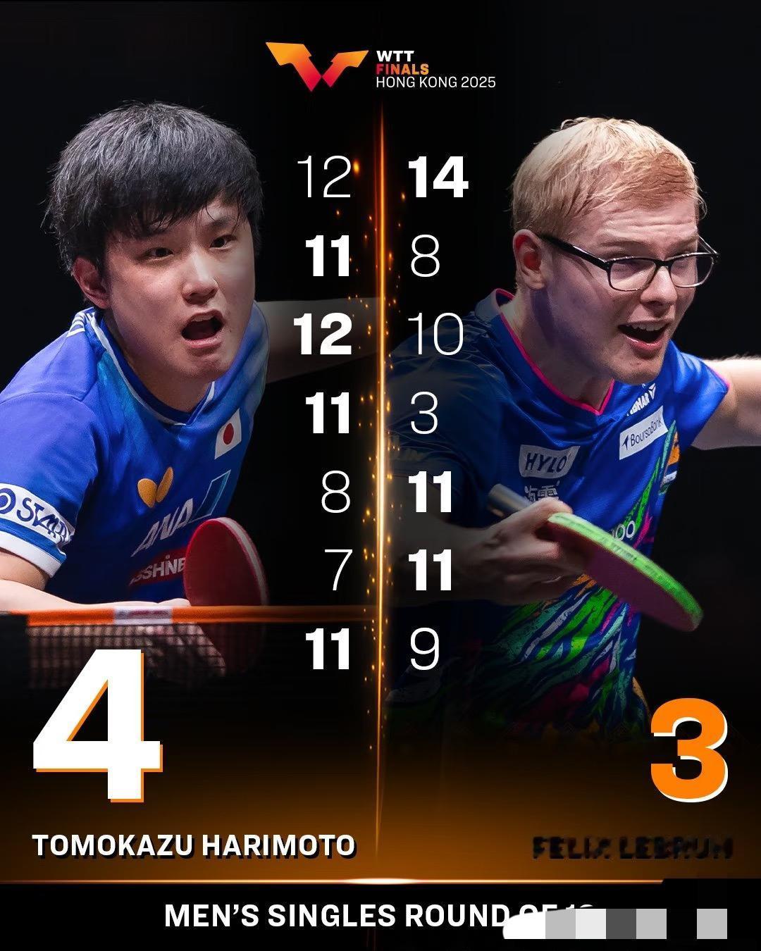 鏖战7局 张本智和4:3险胜小勒布伦晋级半决赛—张本智和跪地庆祝 WTT香港总决赛, 男单1/4决赛, 张本智和首次战胜小勒布伦, 晋级半决赛! 张本智和在赛后采访中表示, 这是自己的一场突破自我的比赛, 意义重大, 以前都是输给小布, 自己一直都在努力,坚定信念, 这场比赛还将继续, 希望可以继续突破自我, 实现最终目标! 张本智和在总决赛的目标就是冠军, 明天半决赛对阵林诗栋, 加油小石头, 拿出成都混团的精神, 加油!