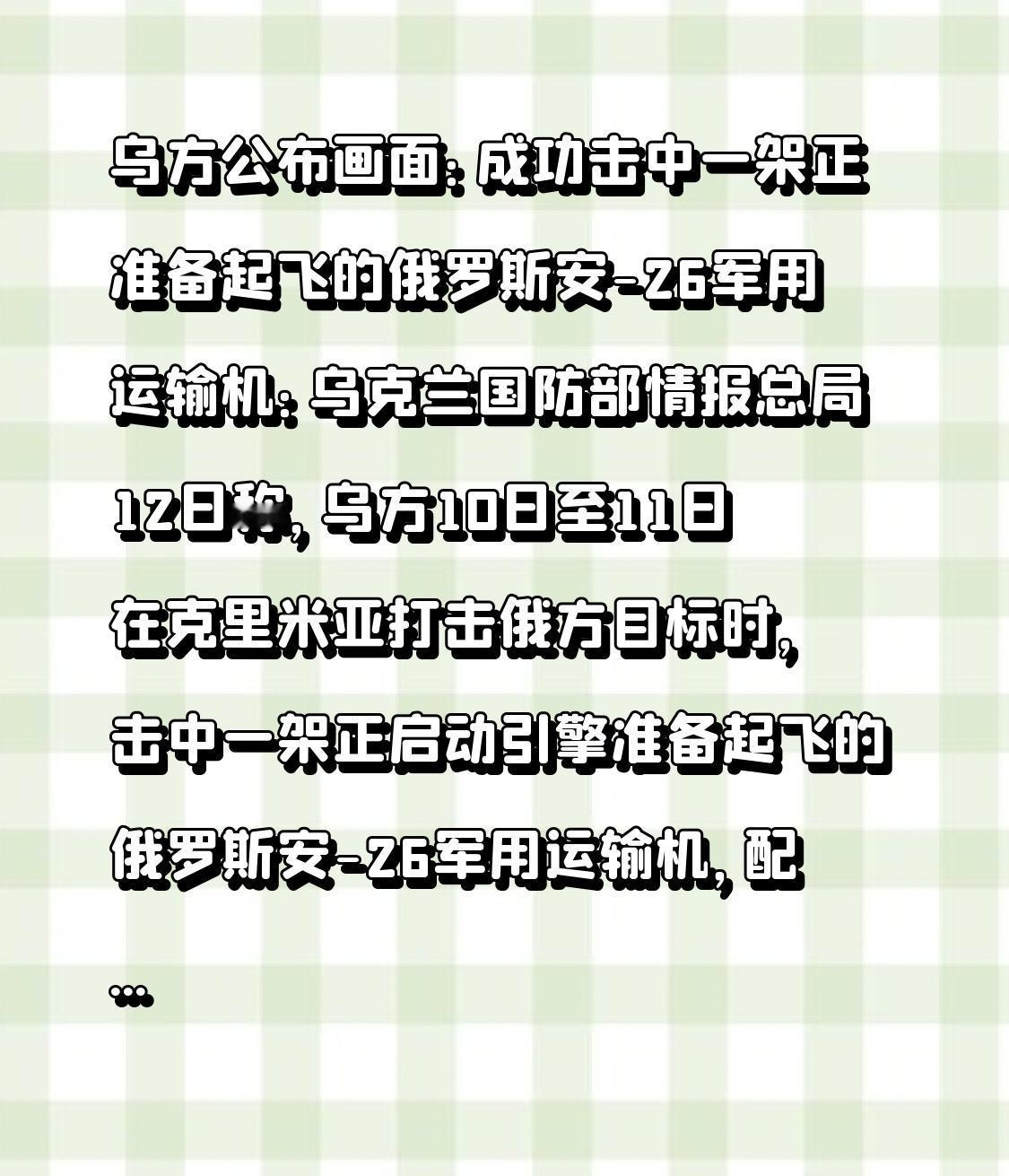 乌方公布画面:成功击中一架正准备起飞的俄罗斯安-26军用运输机:乌克兰国防部情报总局12日称,乌方10日至11日在克里米亚打击俄方目标时,击中一架正启动引擎准备起飞的俄罗斯安-26军用运输机,配打击画面,俄官方暂未回应。
