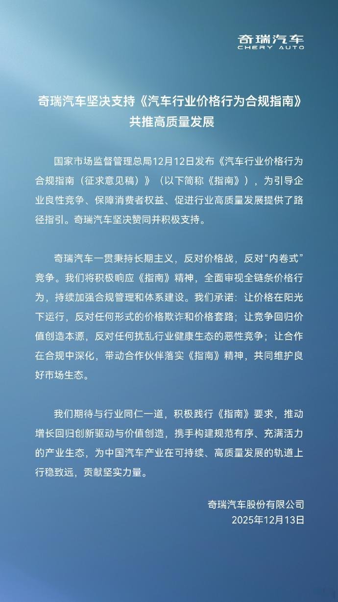 昨日,国家市场监督管理总局对外发布《汽车行业价格行为合规指南(征求意见稿)》。该意见稿针对汽车生产与销售企业,给出了明确、具体且全面的指导与提示,旨在帮助企业规避经营活动中部分具体行为触碰法律红线的风险。今日,奇瑞汽车明确表态,对这份《汽车行业价格行为合规指南》表示支持。奇瑞汽车