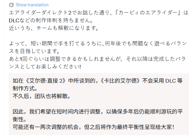 【《卡比的驭天飞行者》开发团队即将解散,游戏更新也将结束】《卡比的驭天飞行者》在Switch 2平台迎来了Version 1.2.0重大更新。游戏总监樱井政博表示开发团队即将解散,因此只剩下很短的时间来进行平衡调整。樱井政博提到:开发团队即将解散,而《卡比的驭天飞行者》没有制作DLC等内容的计划。因此,我们希望在还能进行调整的这段时间里,尽快将游戏平衡调整到无论多少年后都能畅玩无碍的状态。或许还能再进行一次调整,但此后就请大家以完成后的最终平衡状态来享受游戏吧!