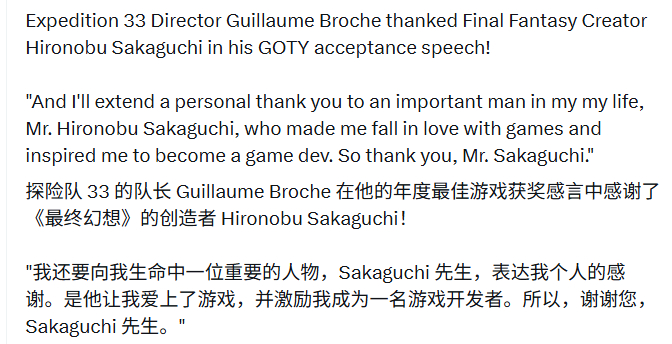 【《33号远征队》总监特别感谢《最终幻想》之父】《光与影:33号远征队》荣膺2025年TGA 2025年度游戏大奖。游戏总监Guillaume Broche在获奖致辞中,特别感谢“《最终幻想》之父”坂口博信的启发。他表示:是他让我爱上了游戏,并激励我成为一名游戏开发者。所以,谢谢您,坂口博信先生。"