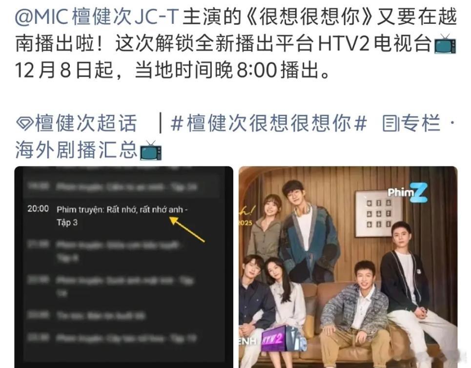 《很想很想你》迎来第二十次海外播出,檀健次塑造的角色魅力与剧集温情基调,即将与越南观众产生情感联结。檀健次很想很想你将在越南播出檀健次很想很想你第20次在海外播出