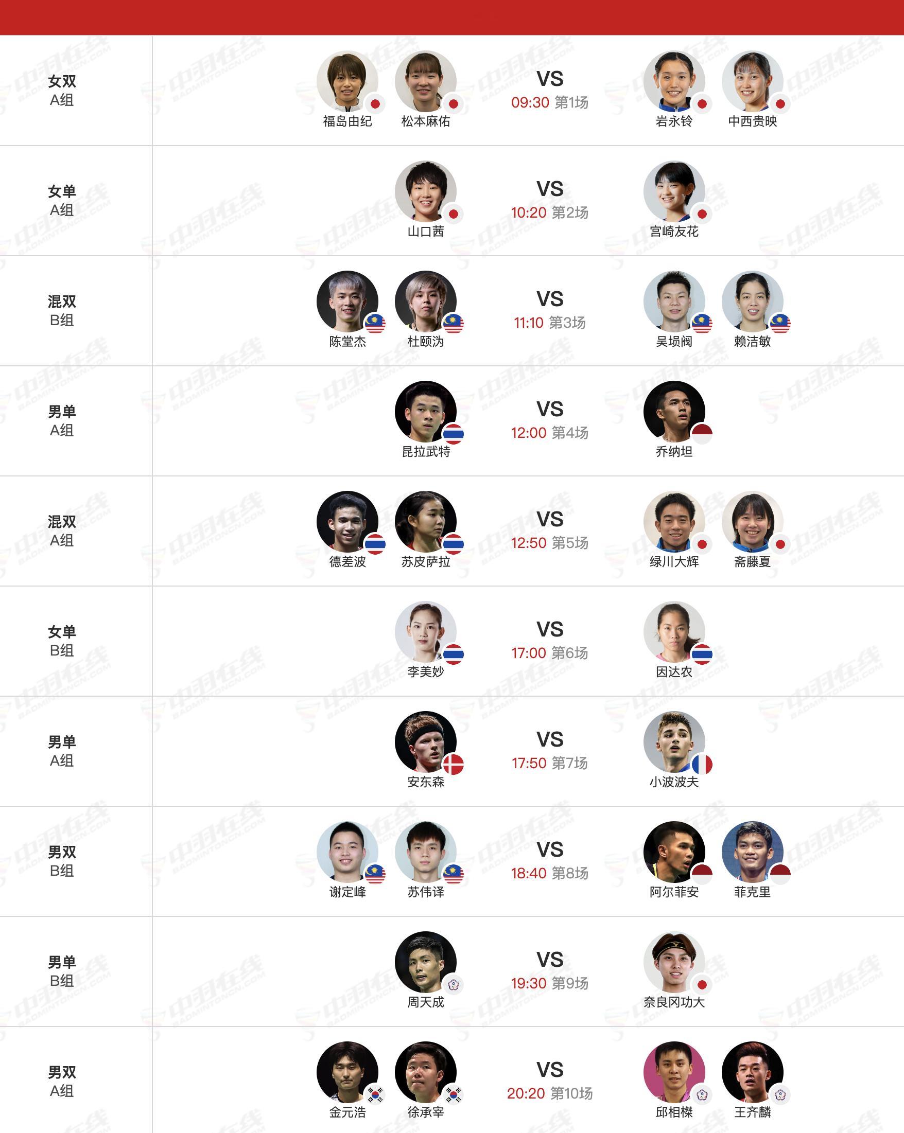 2025年世界羽联年终总决赛 12月17日小组赛第一天,上午场9点半开始,晚场17点开始:【1号场地-9点30分开始】2、冯彦哲/黄东萍🇨🇳 vs 🇮🇩希达亚图拉/费莉莎3、贾一凡/张殊贤🇨🇳 vs 🇲🇾陈康乐/蒂娜5、王祉怡🇨🇳 vs 🇨🇳韩悦【1号场地-17点开始】1、蒋振邦/魏雅欣🇨🇳 vs 🇫🇷吉凯尔/德尔吕2、刘圣书/谭宁🇨🇳 vs 谢沛珊/洪恩慈3、李诗沣🇨🇳 vs 🇨🇳石宇奇4、梁伟铿/王昶🇨🇳 vs 🇮🇳兰基雷迪/谢提