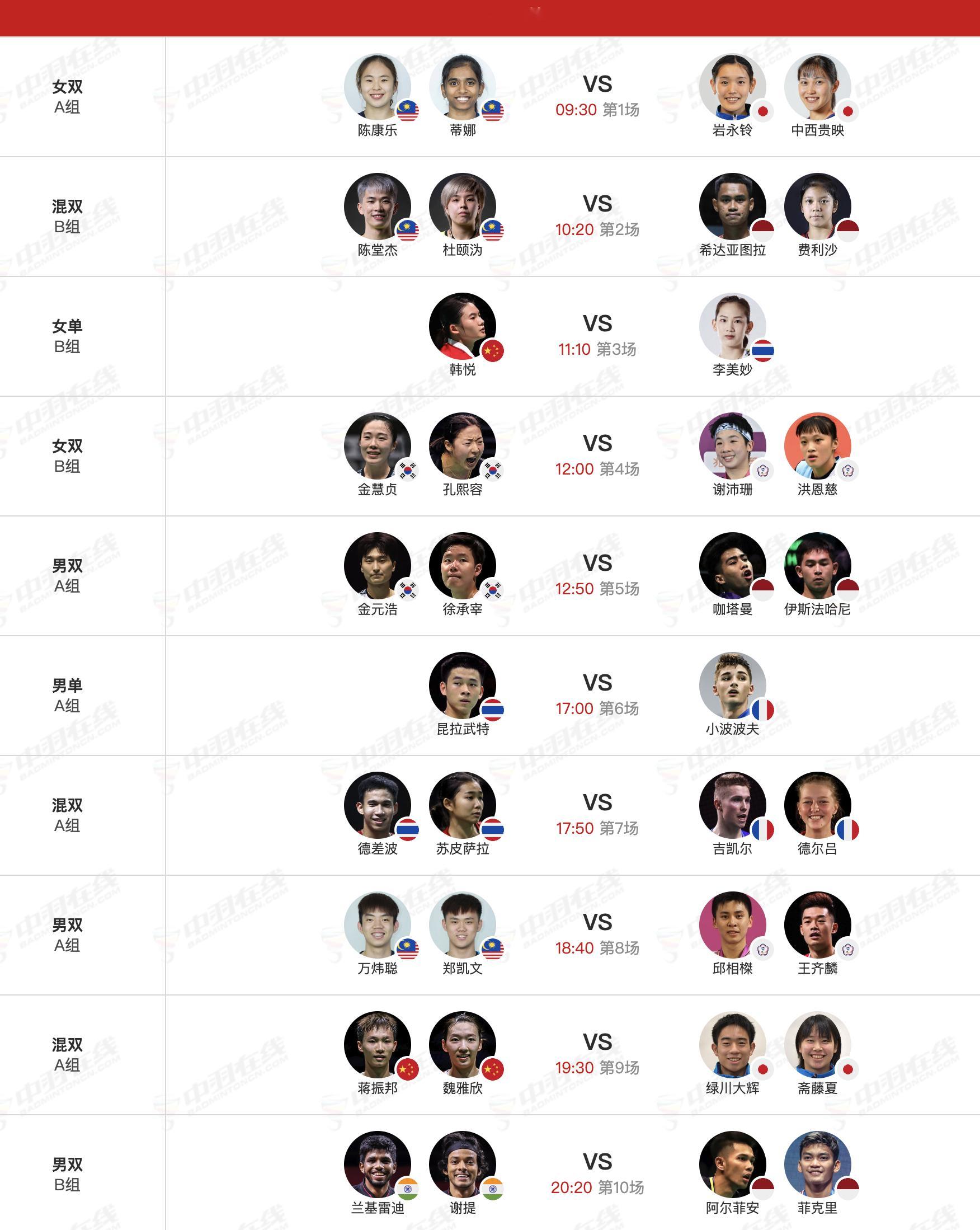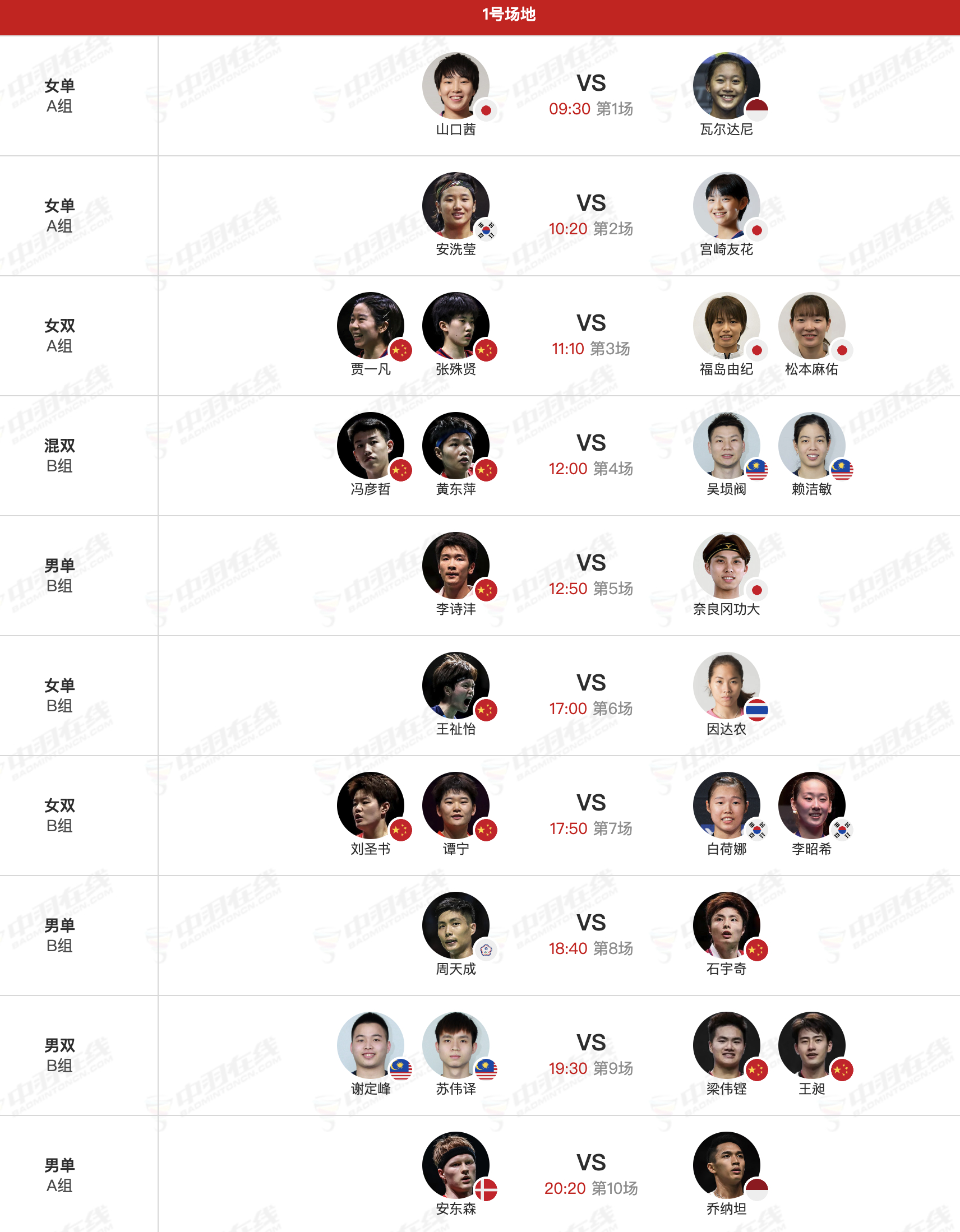 2025年世界羽联年终总决赛 12月18日小组赛第二天,上午场9点半开始,晚场17点开始:【1号场地-9点30分开始】3、贾一凡/张殊贤🇨🇳 vs 🇯🇵福岛由纪/松本麻佑4、冯彦哲/黄东萍🇨🇳 vs 🇲🇾吴埙阀/赖洁敏5、李诗沣🇨🇳 vs 🇯🇵奈良冈功大【1号场地-17点开始】1、王祉怡🇨🇳 vs 🇹🇭因达农2、刘圣书/谭宁🇨🇳 vs 🇰🇷白荷娜/李绍希3、石宇奇🇨🇳 vs 周天成4、梁伟铿/王昶🇨🇳 vs 🇲🇾谢定峰/苏伟译【2号场地-9点30分开始】3、韩悦🇨🇳 vs 🇹🇭李美妙【2号场地-17点开始】4、蒋振邦/魏雅欣🇨🇳 vs 🇯🇵绿川大辉/斋藤夏