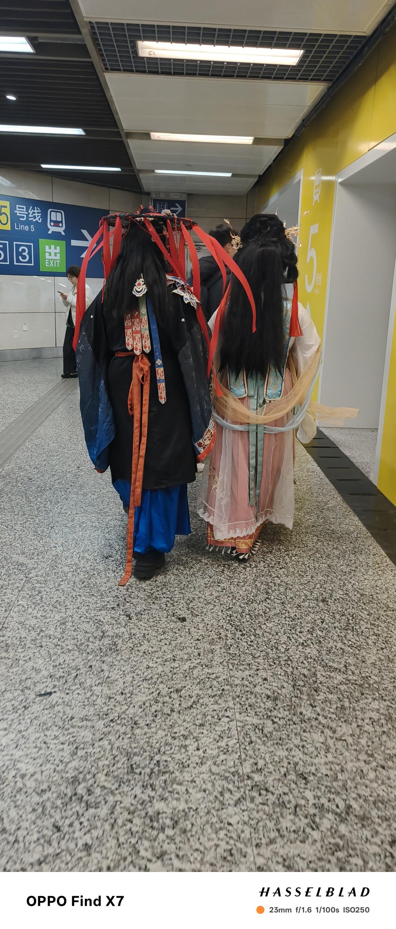 南京的第一天,在地铁口看到两个古装女孩,头上飘逸的红丝带让人挺难接受,这民俗与古风文艺挺特别,相比之下,更喜欢苏州娇滴滴的姨太太们的造型,发髫,细腰,满满的优雅端庄! 孩子说那南京更前卫,敢于尝试新的风格,不像苏州风,都是遗传下来的一成不变,也许这就是年轻人的心理,她们敢于做自己想做的事,尝试新的体验,新的风格,新的感受! 这两女孩的造型是秦淮文化的红丝带祈愿意象设计的国风演绎造型,也融合了汉服与非遗缠花、红绳祈福的传统元素,是结合南京地域文化的创意古风造型。 无锡祈福是在树上系上红丝带,这戴在头上咋感觉有点怪怪的!