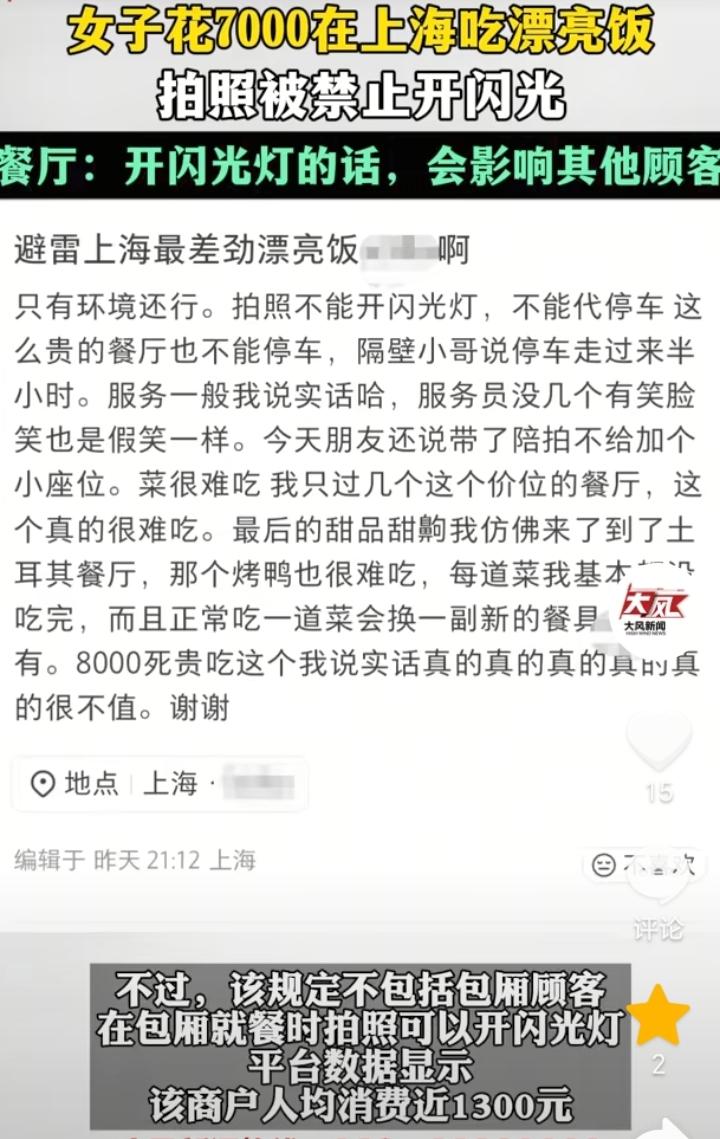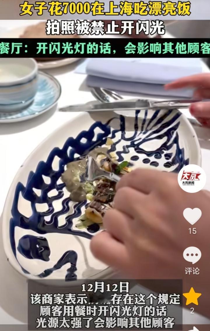 拍照禁止开闪光!上海,一女子在餐厅花费7000元就餐,然而商家却是不允许拍照开闪光灯,原因是因为开闪光灯光源太强会影响到其他顾客,不过这一规定不包括包厢顾客,根据平台数据显示,该商户人均消费近1300元。 既然规定不是针对某一个人,也不是根据消费多少而定,而是本来一直都有这样的规定,那么不管是谁都理应遵守,不想遵守可以不去他家吃饭,去了那就应该按照餐厅规矩来。 可能女子纠结的是自己消费了7000元,结果还不让拍照,心里觉得不平衡,不过换一个角度来讲,首先商家是否提前告知拍照不能开闪光灯,如果没有提前告知那么商家也是有责任,其次吃一堑,长一智,觉得对方服务不好下次不去就行了。