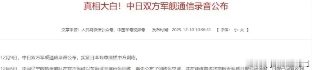 中国军方晒录音实锤日本军事碰瓷。今天上午北京军方对外公布争议通话音频,称其为无可辩驳的证据,直接驳斥日本防卫大臣小泉此前言论。 12月6日周六,中国辽宁舰编队在西太平洋公海例行训练。平日周末歇业的日本防卫省,破天荒搞起实时直播。周日凌晨小泉急赤白脸召开记者会,指责中方进行长达30分钟火控雷达照射,特意选在国会审议防卫预算前夕,借周末信息空窗期抢先扣破坏规则的帽子。 火控雷达锁定目标就像猎手瞄准猎物,几秒就能搞定,根本没必要耗半小时,服役近40年的F-15J面对航电换代的中方战机毫无优势。录音里中国参谋官清晰通报坐标,点明对方距我方舰艇不足5海里,戳穿日方私自改海图耍滑头的套路。 小泉10日承认中方事前通报训练安排,却辩解信息不充分。美国仅模糊表态称中方行为不利地区稳定,未公开为日方撑腰。日本评论员呼吁高市内阁辞职,东京街头竞选海报被撕,媒体罕见严厉抨击。日方后续装聋作哑,小泉躲着媒体不露面。 中方硬证据反击成明显转折点,暴露日方借炒作刷存在感拉美国撑腰的心思。伪造海图改不了经纬度,过时战机挡不住现代化体系。日本这回碰瓷彻底露怯?