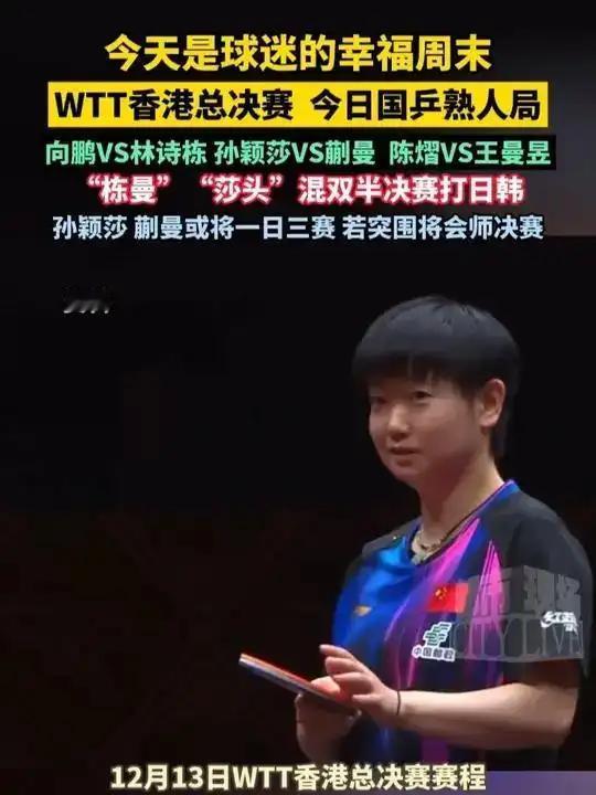 国乒女单包揽四强,香港总决赛半决赛今日开战! 12月12日,WTT香港总决赛女单赛场传来振奋消息!中国乒乓球队火力全开,孙颖莎、蒯曼、王曼昱、陈熠一路过关斩将,成功包揽女单四强席位,提前将冠亚军收入囊中,再次展现国乒在世界女子乒坛的统治力! 孙颖莎一日双赛仍状态神勇,4-0横扫日本选手长崎美柚,首局2-5落后却以12-10逆转,尽显大将风范。蒯曼在大比分1-2落后的情况下,连扳三局逆转日本选手大藤沙月,展现顽强斗志。陈熠与陈幸同的国乒内战中,陈熠先失一局后连赢四局,强势晋级。王曼昱则以4-1战胜韩国选手朱芊曦。 12月13日,女单半决赛激战将启!孙颖莎与蒯曼、王曼昱与陈熠将展开巅峰对决。央视体育频道全程直播,CCTV5+ 13:30、CCTV5 19:30准时开赛,一起为国乒加油,见证冠军诞生!