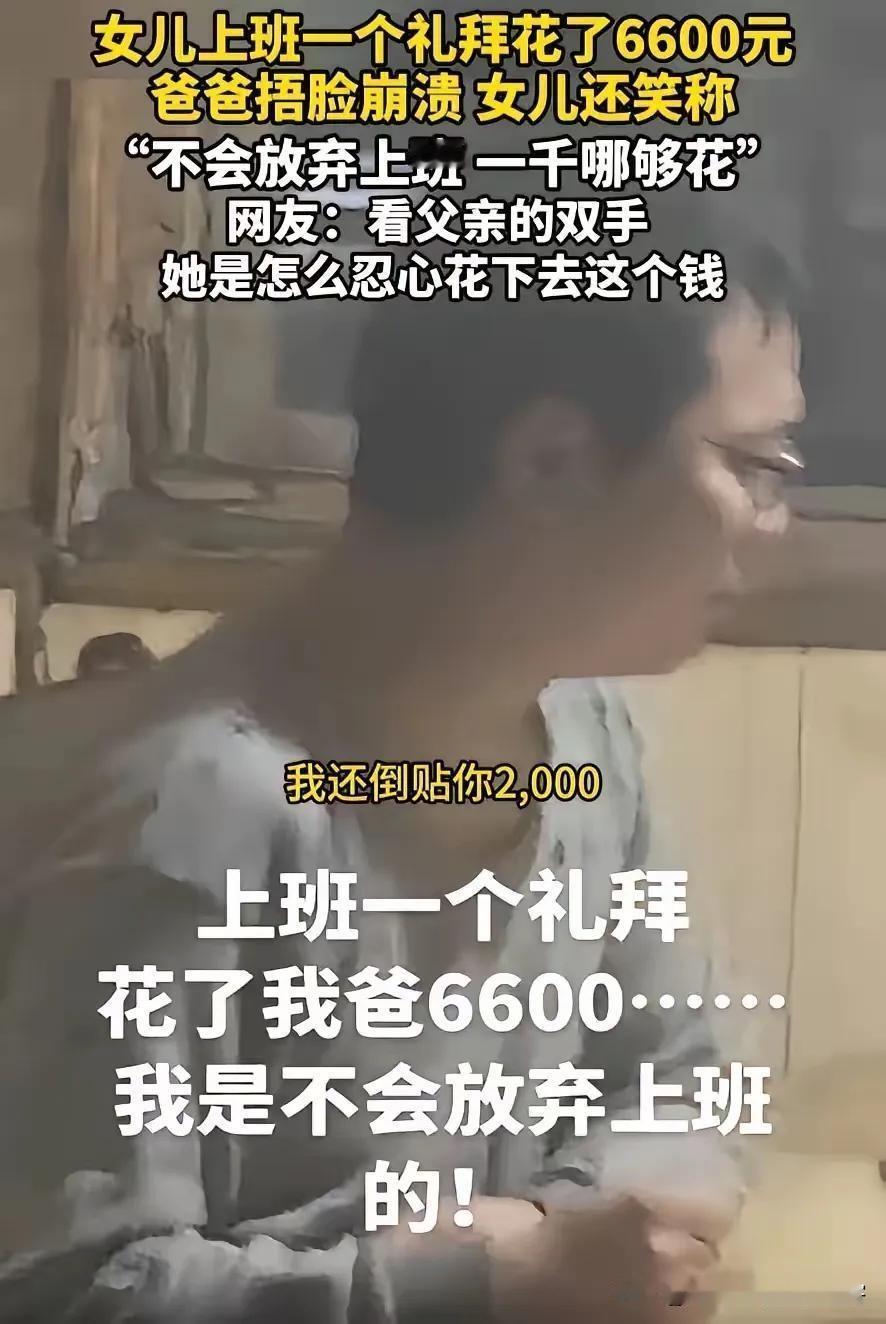 没有公主命却得了公主病! 上海,一位女生上班一个礼拜辞职了,虽然自己只挣了1000块钱,却眼睛都不眨花了父亲6600块钱,当她向父亲炫耀自己1000元根本不够花时,父亲捂着脸崩溃痛哭。 那双布满旧伤、连握杯子都吃力的手,掏出来的哪里是钱,是拼尽全力想让女儿过得好的真心,可在女儿眼里,不过是随手可取的提款机。 穷人儿女哪有时间教育都是社会有权有钱人教的。普通人都在忙着为生活搬砖。 可怜之人必有可恨之处,养不教父之过。 网友表示:看过视频,这个父亲少了两根手指。 以前说的富养女儿,专指的是地主富人家,毕竟以前普通人想富养都没这能力。 穷养男儿志,富养女儿德。穷,尽也,养男儿应使其胸有志向奋尽全力不惧艰难。富,广也。养女儿当丰其见识满其心志远避欺辱。 富人钱多富养无所谓,但是普通人一个月的收入就那么几千块,要教孩子赚钱不容易不要乱花钱,而不是无底线随便给孩子钱,让他们觉得钱来的太容易了,后面苦的只是是自己。 各位读者,你们怎么看?欢迎评论区留言讨论!