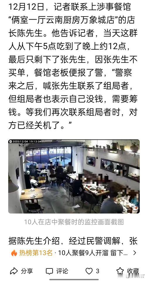 十人组局会餐,其他人陆续离开,最后留下一个人却又不愿付账。警察到场后,此人书面承诺联系组局人第二天付款,却最终没有兑现。 请人吃饭却又不愿花钱,这种组局者也算难得一见,遇到了也是够倒霉的。但既然吃了饭,至少也该把自己那份饭钱给出了,早点把事情了结,何至于闹得全国都知道了?人均两百块钱,能看清各自的担当,教训也不算太贵。[笑哭]