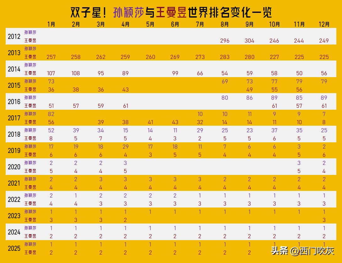 【国乒女单双子星!孙颖莎与王曼昱职业生涯至今世界排名对比一览!】 王曼昱率先进入WTT世界排名体系,孙颖莎晚了两年半。王曼昱于2017年底首次进入世界前十,孙颖莎于2019年首次进前十。 在王曼昱稳定在世界三四名的时候,孙颖莎进入了世界前二。从2019年末,孙颖莎世界排名超过王曼昱后,再也没有被后者反超。 从2023年开始两人全面进入巅峰,开启了双子星统治乒乓球女单时代,孙颖莎战绩更稳。