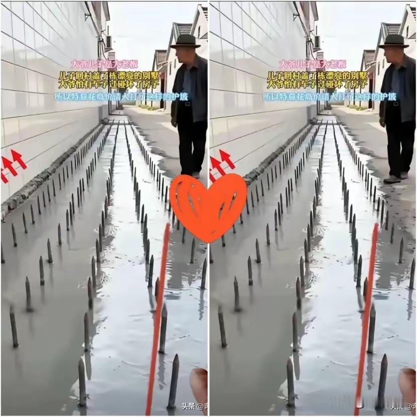 房子周围立上钢筋,钢筋又弄得尖尖的,这就有点太过分了,而且也是非常危险的,不知道这是什么地方,怎么会有这样的习俗,为了保护自己的房子,这样的手段也都用上了,按道理说,这应该已经违反有关规定了,如果一旦造成后果的话,必然要承担法律责任!