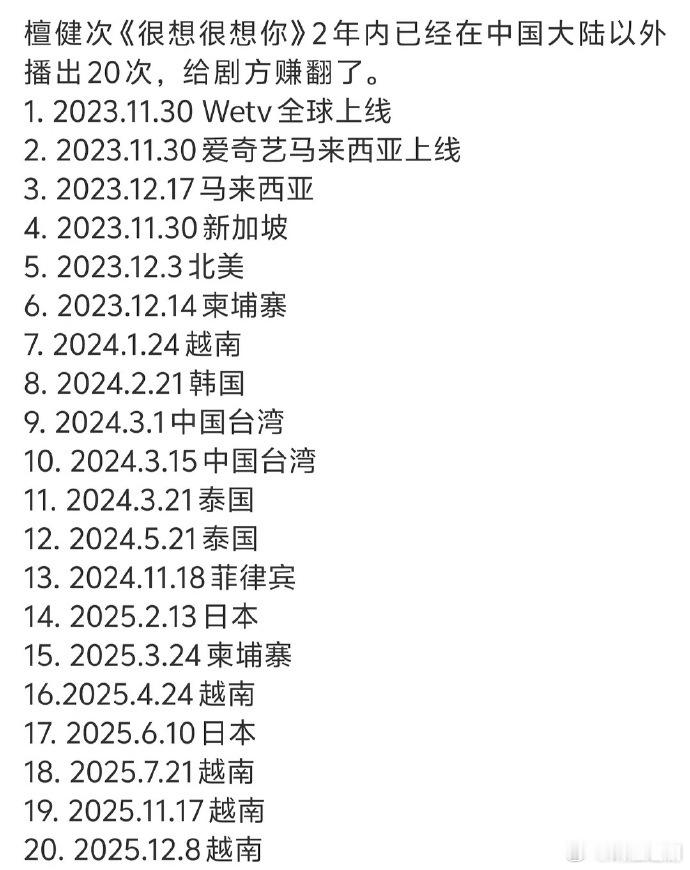 檀健次很想很想你在大陆外播出20次,海外输出真的好强