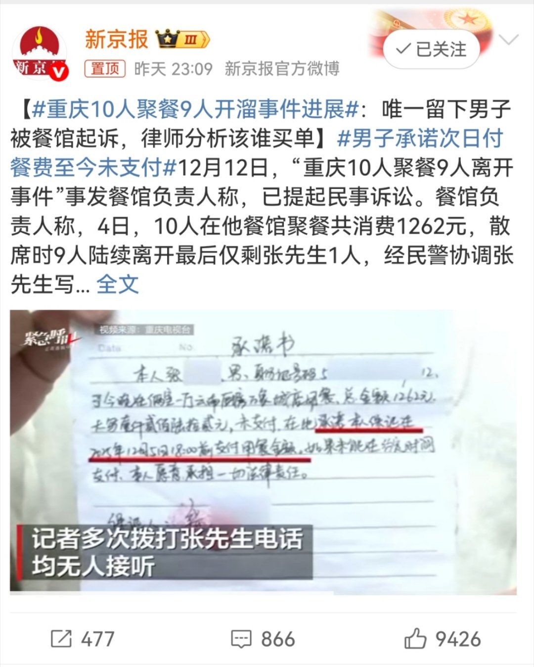 重庆10人聚餐9人开溜事件进展现实生活中,能凑足一桌这样“有情有义”的食客,还真