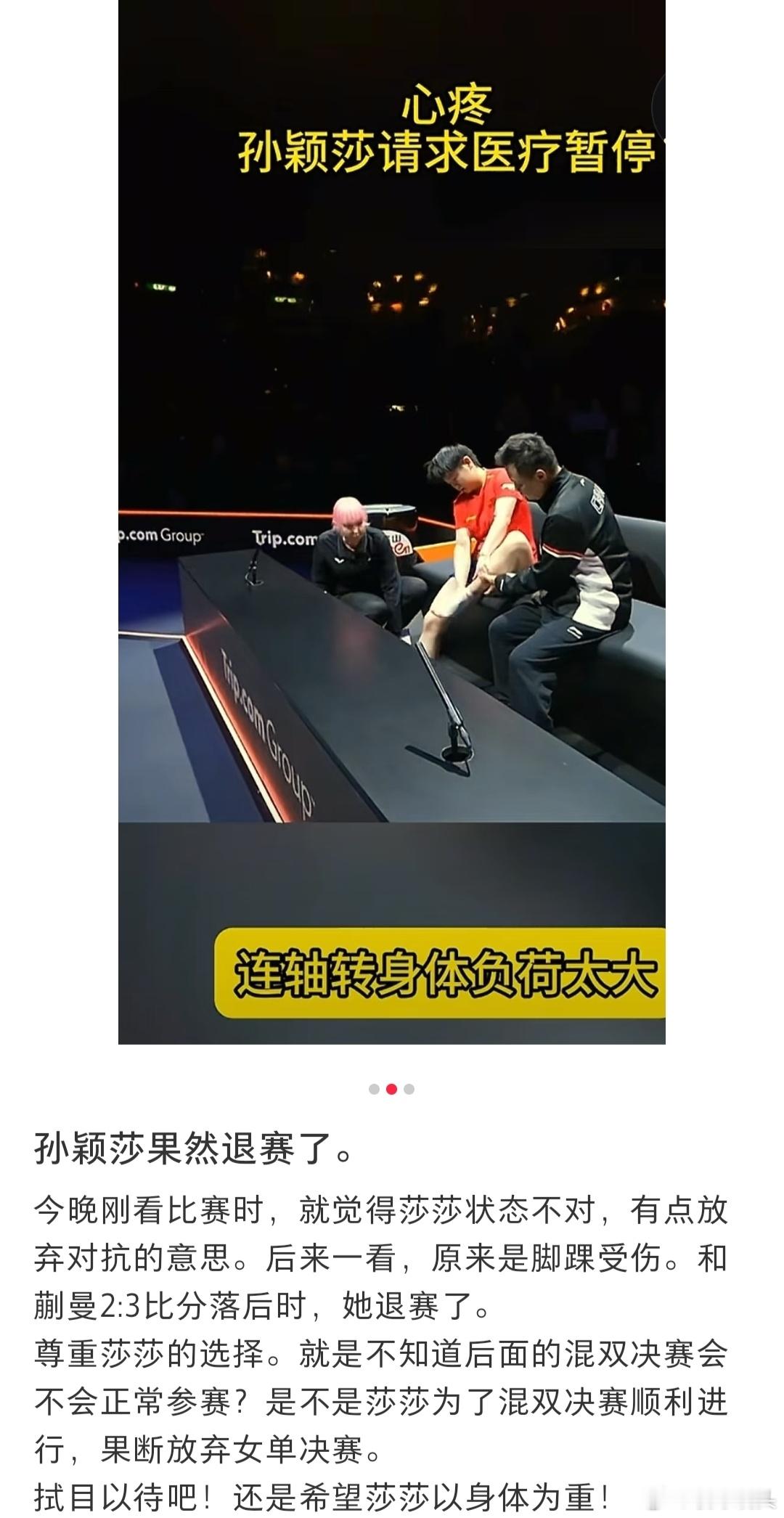 孙颖莎受伤退赛莎莎的身体健康是第1位的,以后的日子还长。希望莎莎能够安心养伤,早日康复!