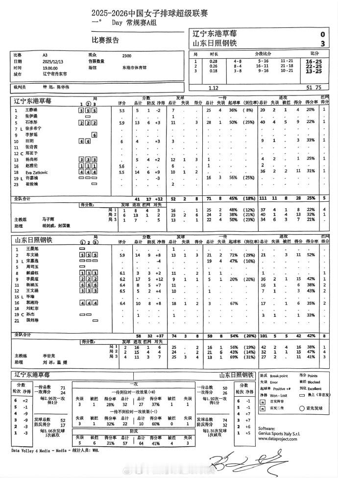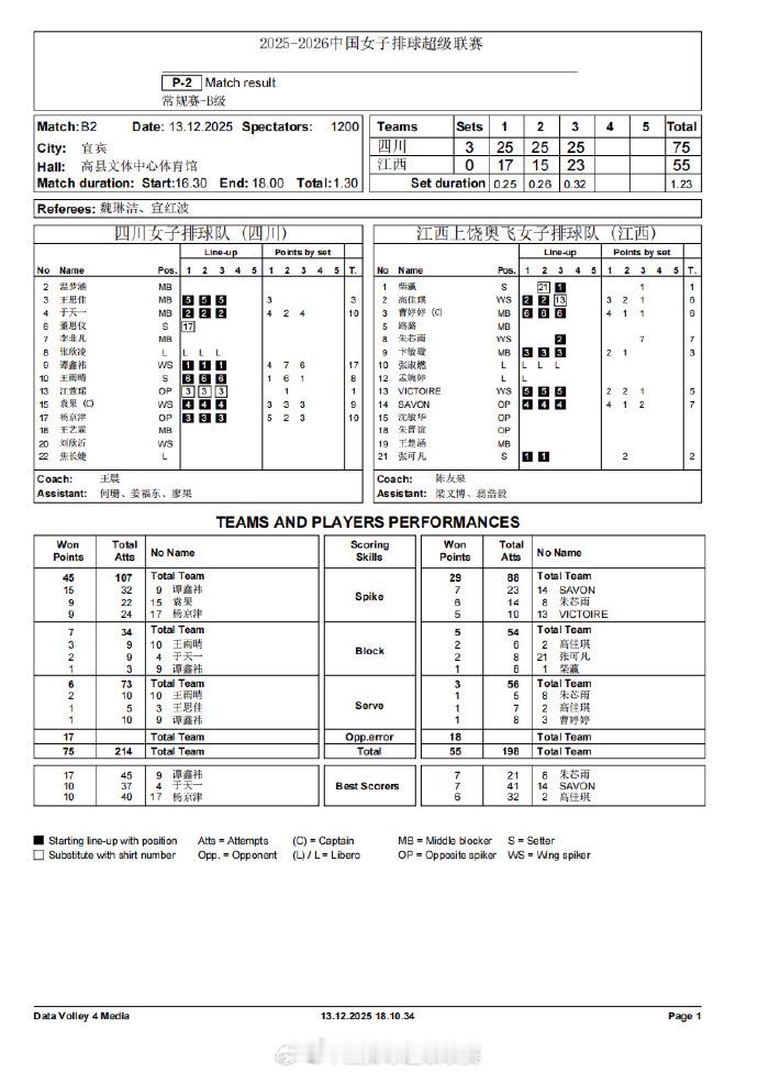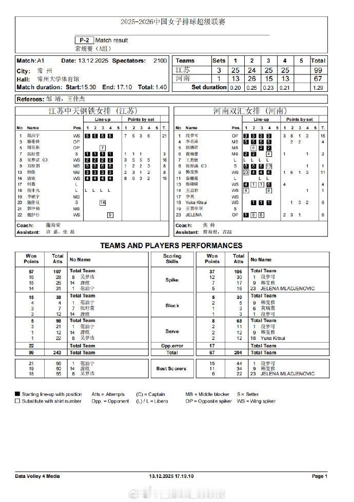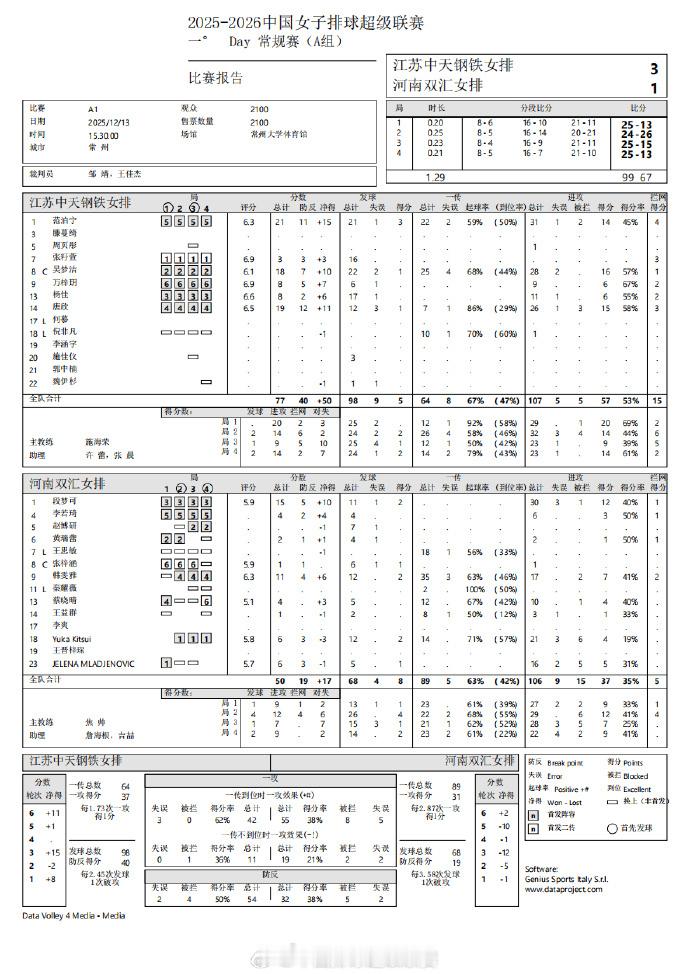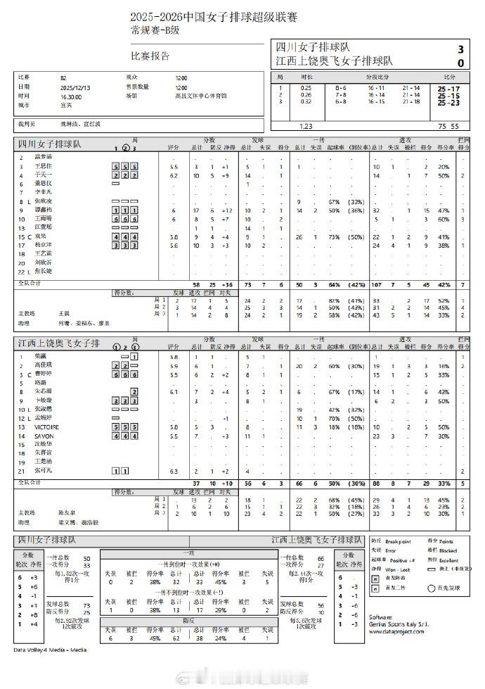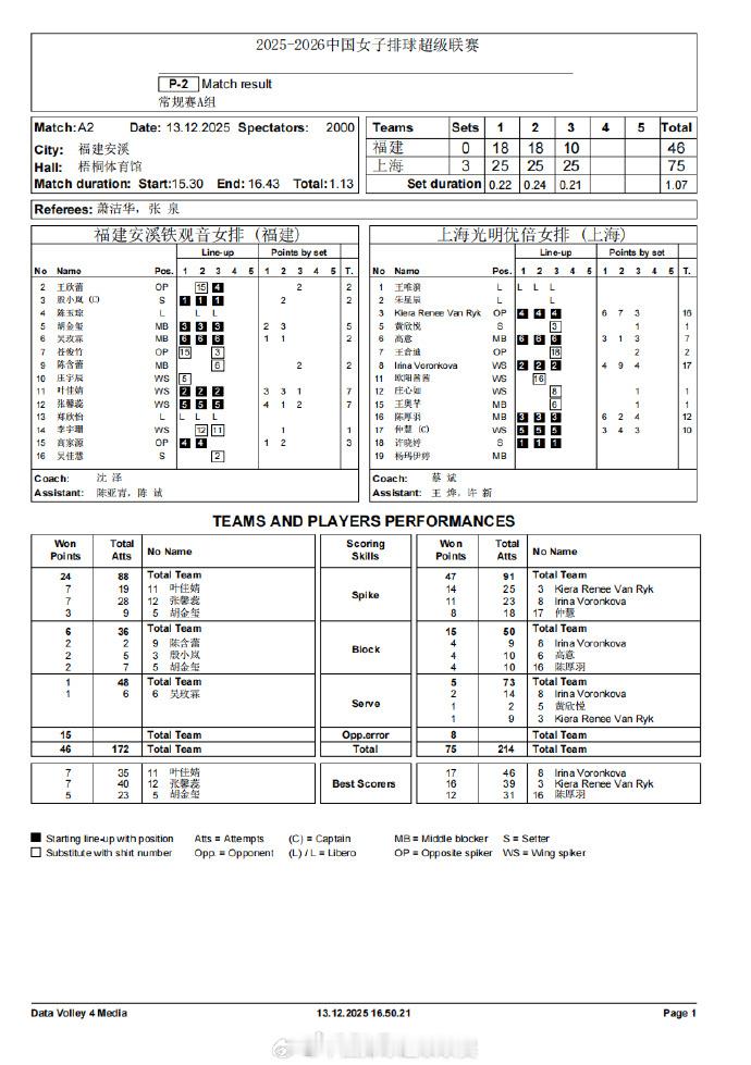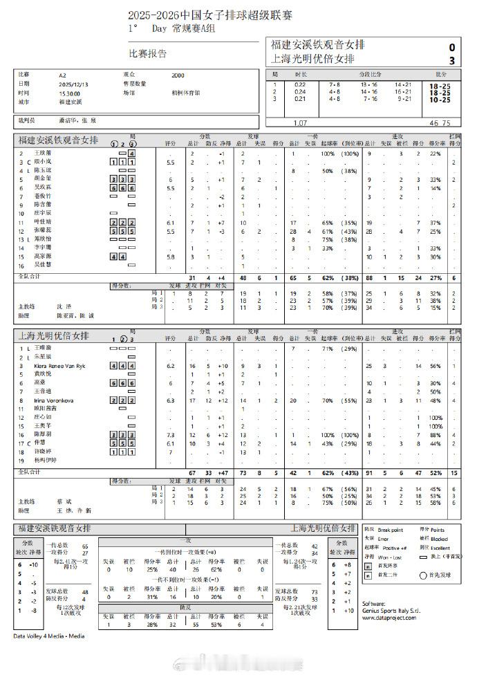 【排超女排联赛今日赛果和技术统计】排超联赛 12月13日,排超女排联赛首轮进行了五场比赛,赛果如下,技术统计见图:A级:江苏3-1(25-13/24-26/25-15/25-13)河南福建0-3(18-25/18-25/10-25)上海辽宁0-3(16-25/22-25/13-25)山东B级:四川3-0(25-17/25-15/25-23)江西浙江3-1(25-23/16-25/25-22/25-18)云南