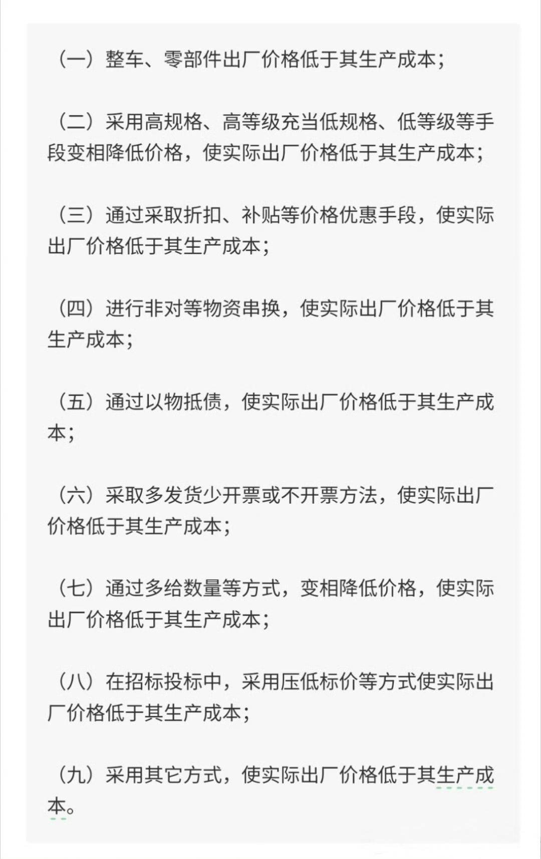 昨天市场监督局发了一个文件,这可能是明年车企【淘汰赛】下,一些品牌活不下去的最后一根稻草。 文件规定: 1,车企不能够低于成本价卖车,价格战不可取。 2,有些车企不降价,但是以增加配置的方式变相降价。 现在这条路也给你堵死了,高配置低价格,也不行。 3,有些车企不降价,但是给补贴或者终端优惠方式变相降价。 现在这条路也给你堵死了,不行。 总之,国家应对价格战态度很明确,价格战就是【断子绝孙】式的竞争,看上去消费者买到了便宜车,但其实破坏了全行业经济生态。 现在新能源汽车不仅没有实现高质量发展,反而税收变少,就业变少,到处降薪裁员,这不是上头想看到的。 汽车行业4.5%的利润率,已经比整个工业领域利润率6.5%低了。 目前,龙头老大哥比亚迪第一个响应,不打价格战。【来自懂车帝车友圈】